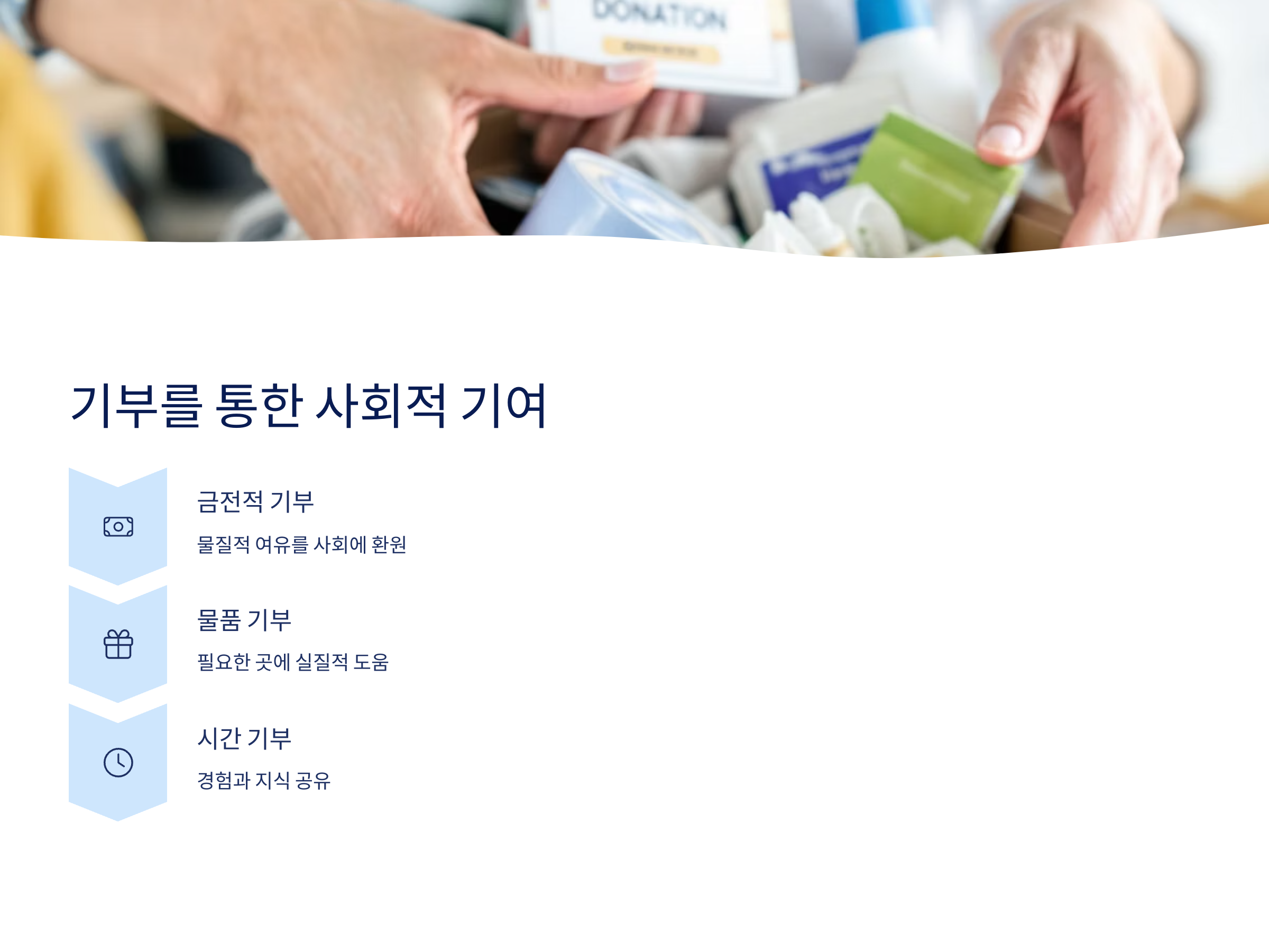 기부는 퇴직 후 가장 직접적인 나눔의 형태 중 하나입니다. 금전적 기부뿐만 아니라 물품 기부, 시간 기부 등 다양한 방법으로 기여할 수 있습니다. 퇴직 후 여유가 생기면서, 물질적인 여유를 사회에 돌려주는 것이 큰 의미가 있습니다. 기부는 지역사회에서 필요로 하는 다양한 기관들에 도움이 되며, 나 자신의 삶에도 큰 만족을 줍니다.