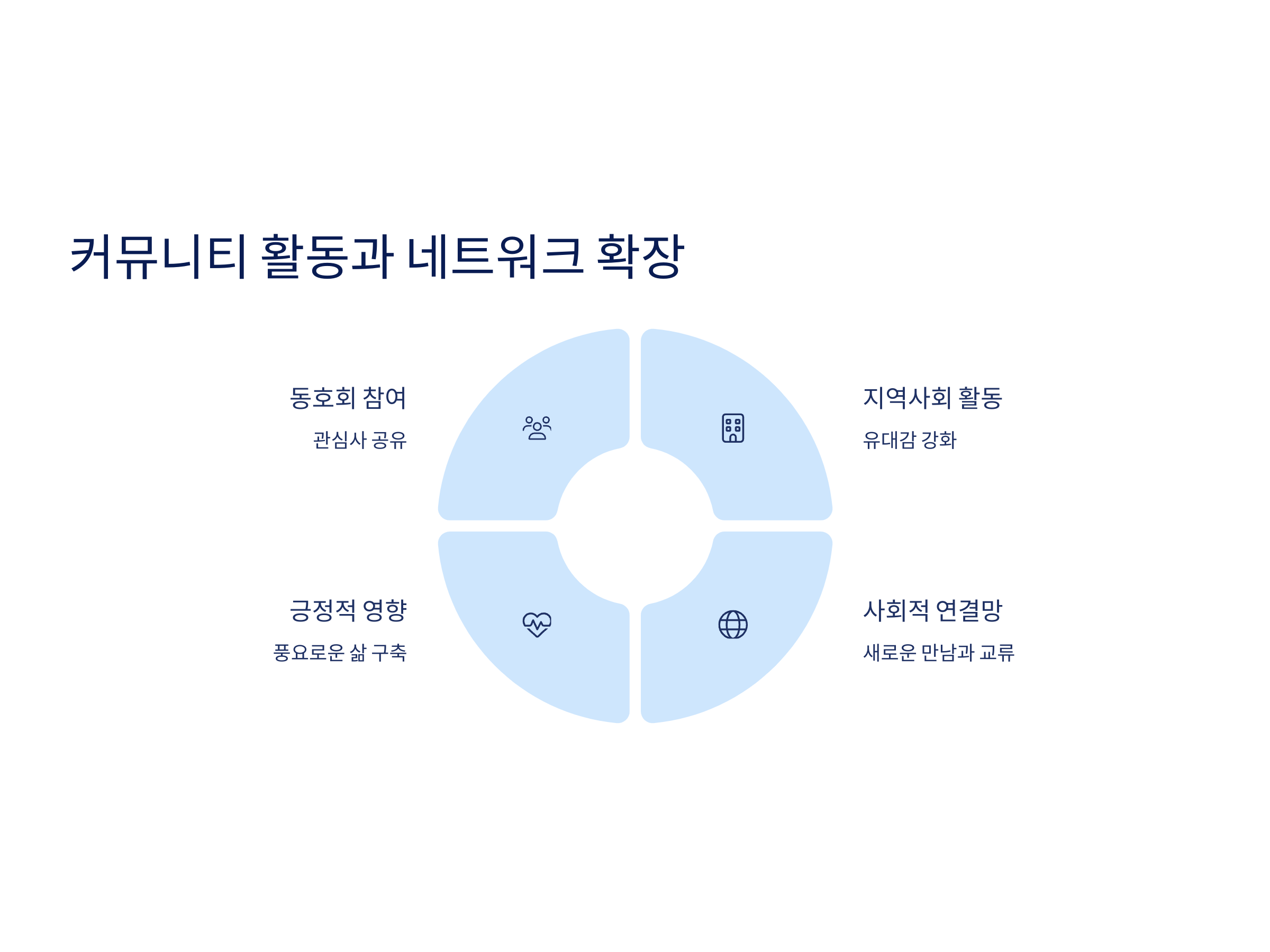 퇴직 후에도 커뮤니티 활동을 통해 다른 사람들과의 관계를 유지하고, 새로운 네트워크를 확장할 수 있습니다. 다양한 동호회나 사회적 활동에 참여하면서, 나의 관심사와 경험을 나누는 것은 나 자신에게도 긍정적인 영향을 미칩니다. 또한, 사회적 연결망을 강화함으로써 지역사회와의 유대감을 더욱 돈독히 할 수 있습니다.