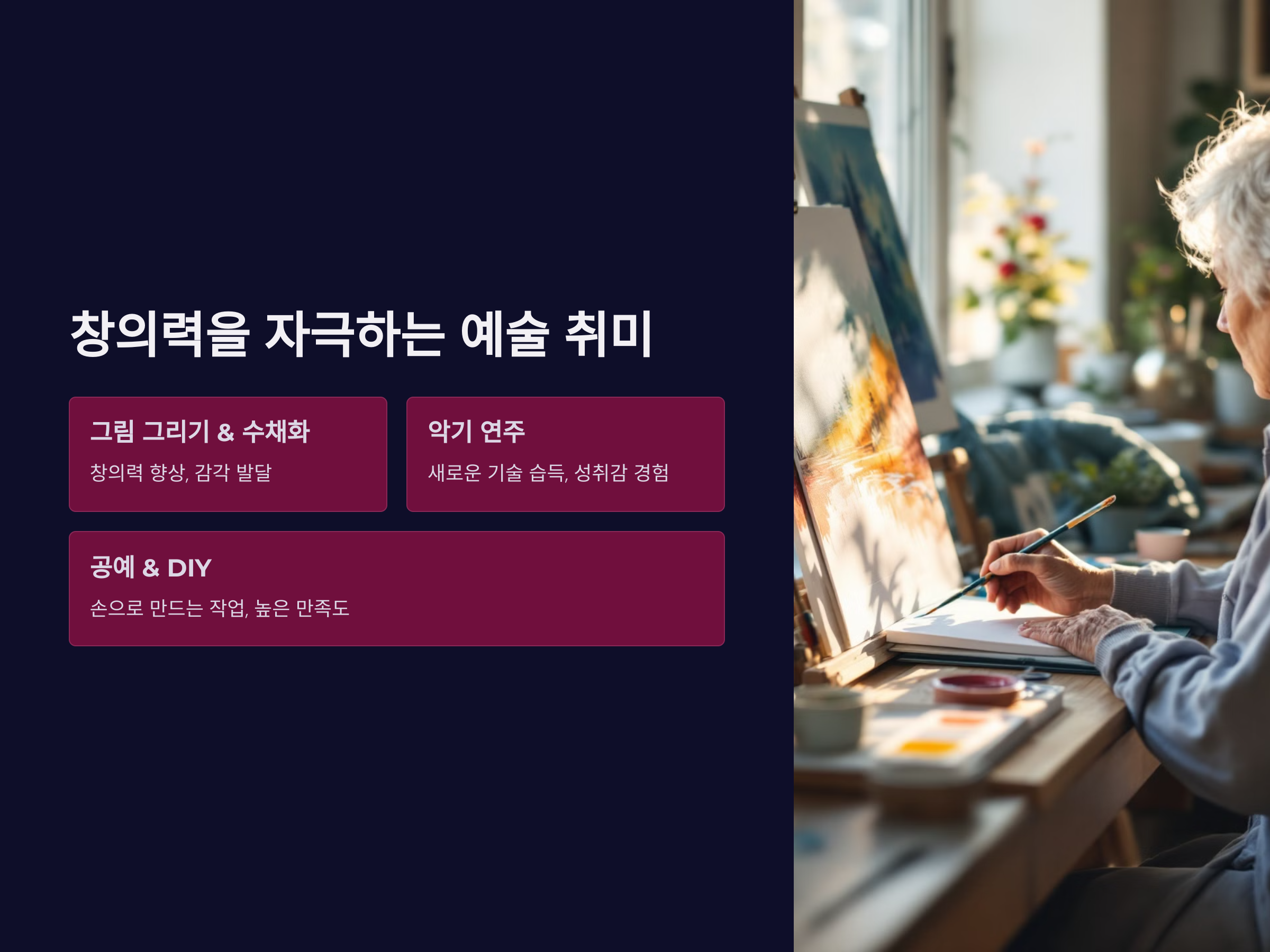 예술적 취미는 감성을 풍부하게 하며, 스트레스 해소에도 효과적입니다. 특히 집중력을 필요로 하는 활동은 몰입의 즐거움을 느끼게 해줍니다.