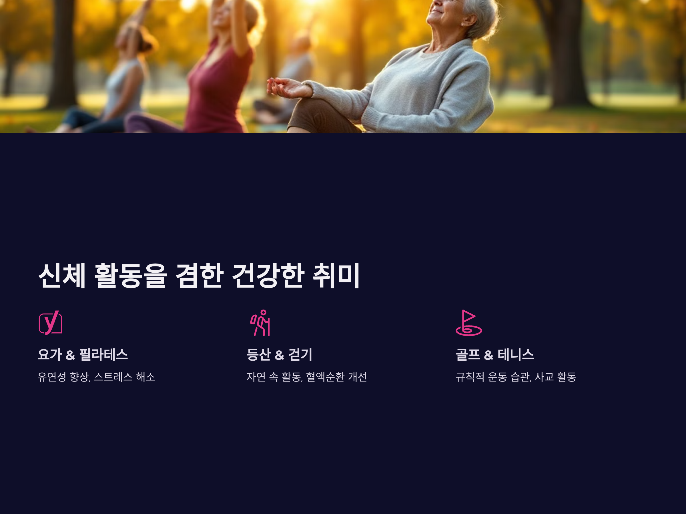 활동적인 취미(예: 등산, 요가, 수영 등)는 신체 건강을 유지하는 데 도움이 됩니다. 운동 부족은 노화 속도를 빠르게 할 수 있기 때문에 꾸준한 신체 활동이 필요합니다.