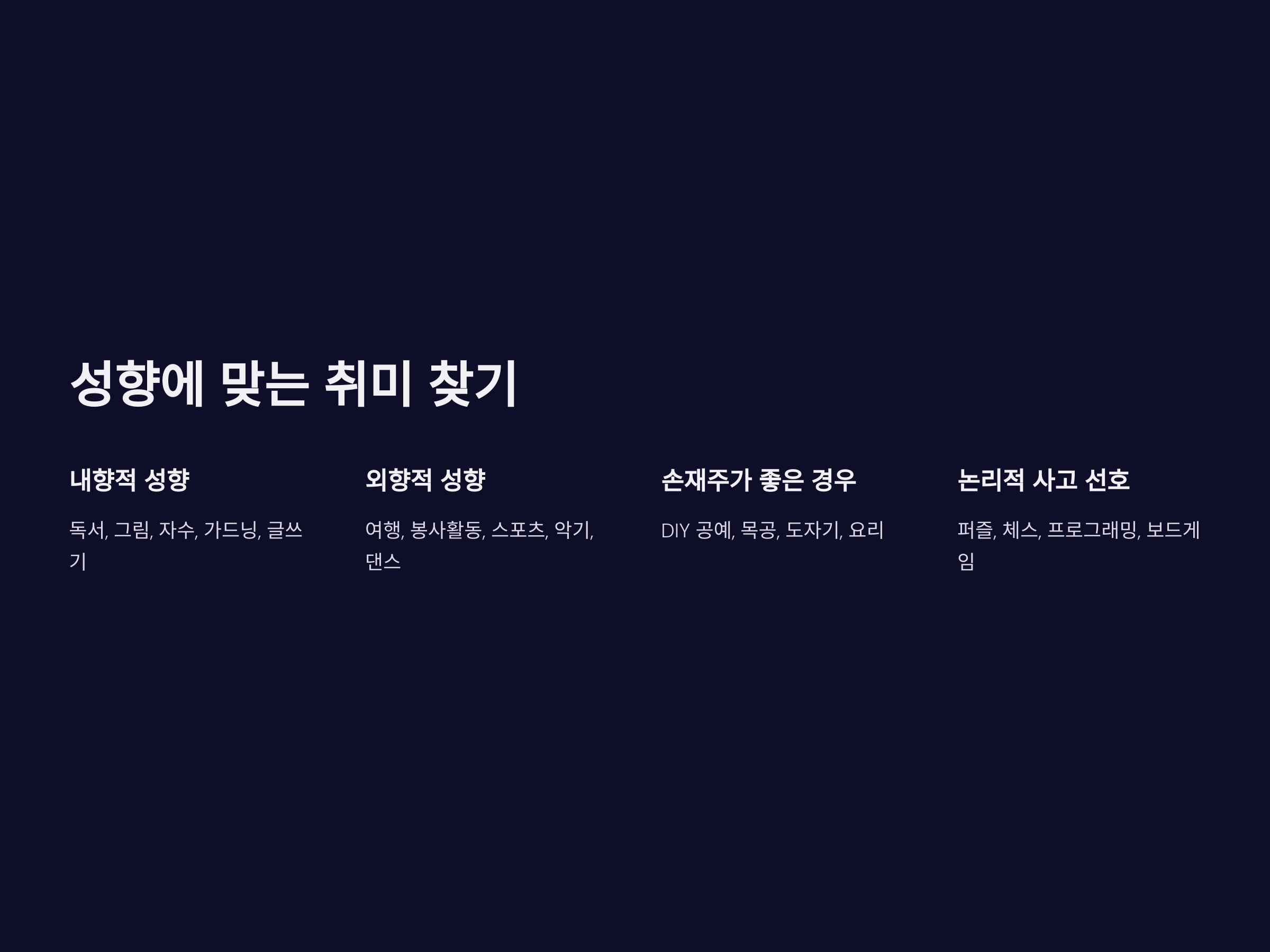 자신에게 맞는 취미를 찾기 위해서는 먼저 자신의 성향을 파악하는 것이 중요합니다. 성격 유형에 따라 추천하는 취미는 다음과 같습니다.