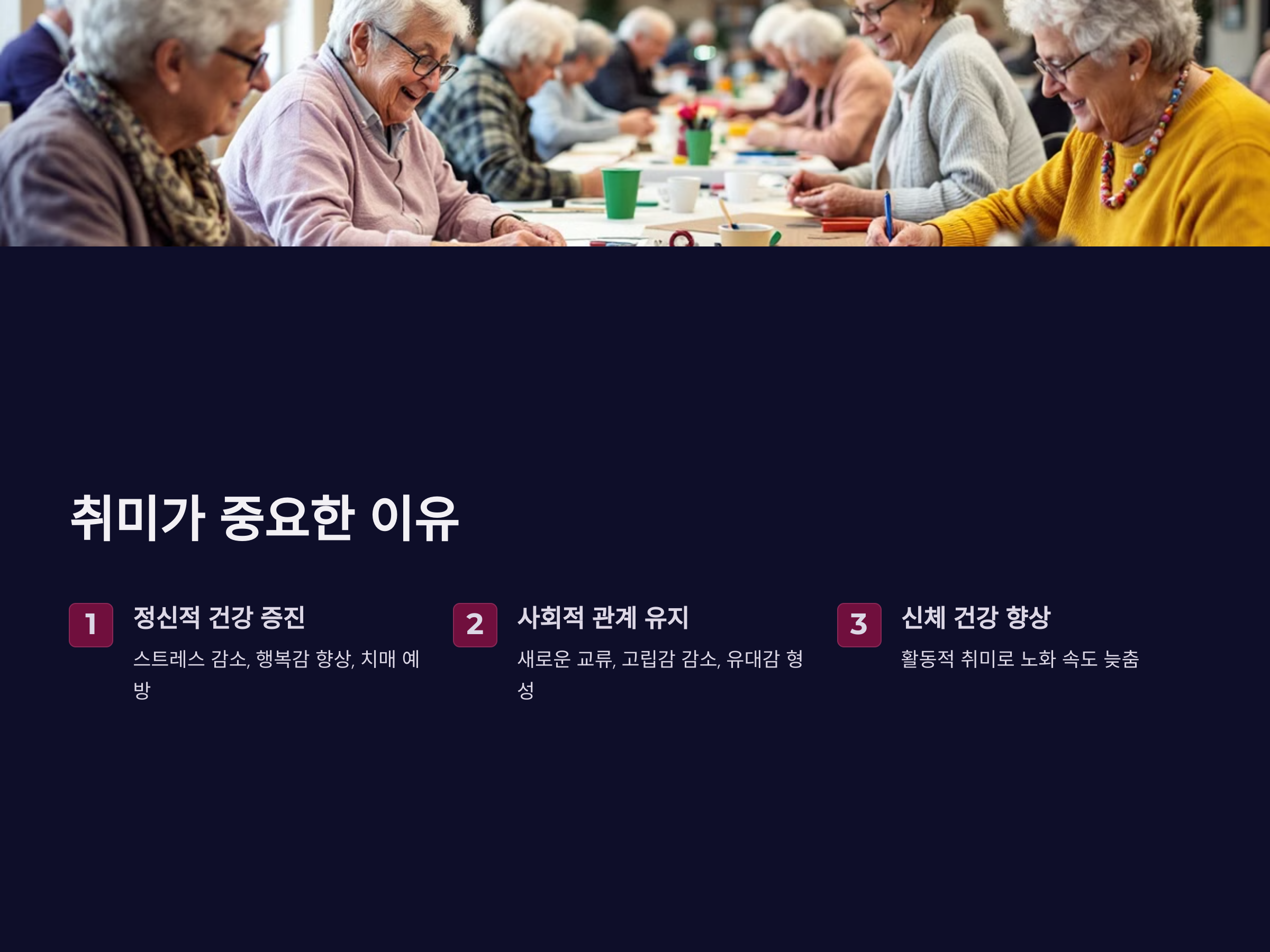 취미 활동은 스트레스를 줄이고 행복감을 높이는 데 큰 도움이 됩니다. 특히 창의적인 활동이나 새로운 기술을 배우는 것은 뇌를 자극하여 치매 예방에도 효과적입니다.