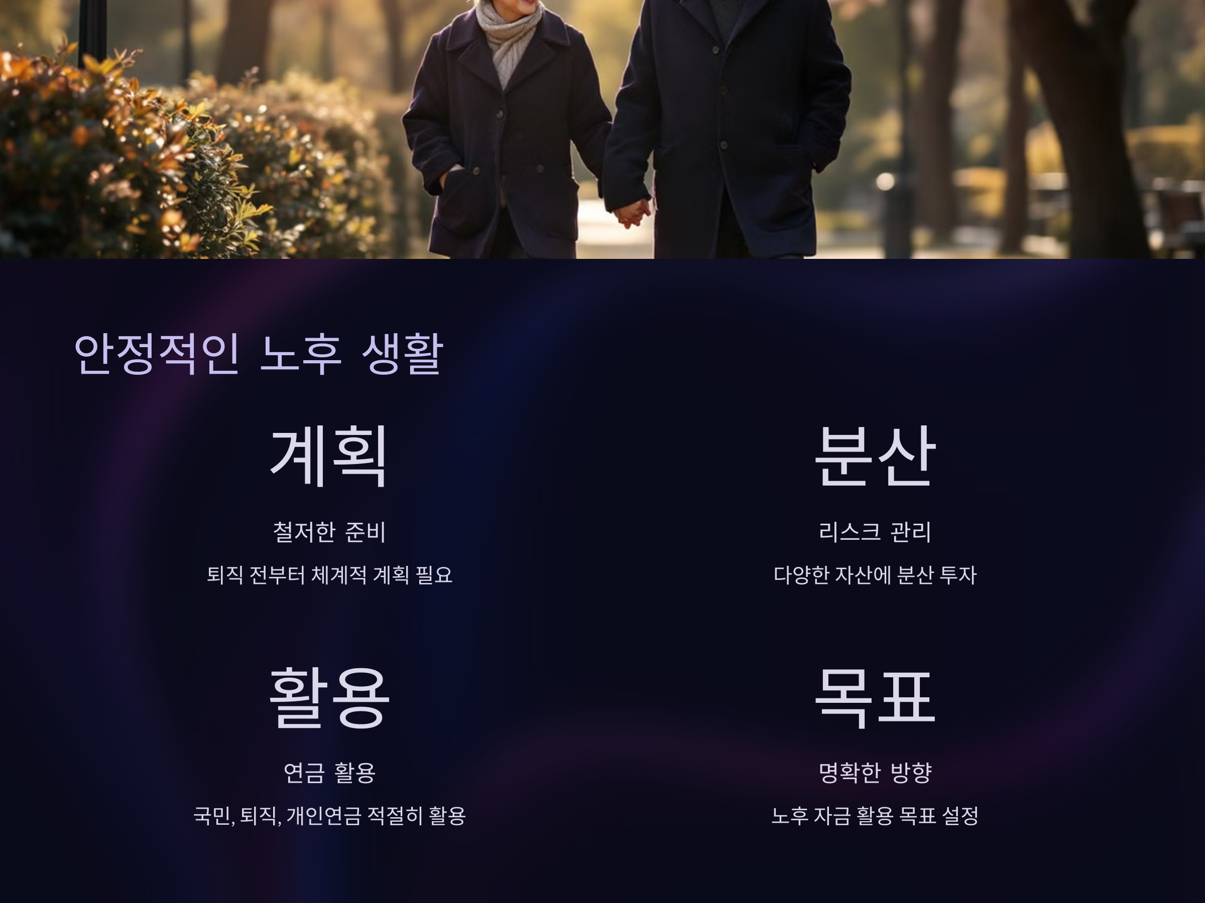 퇴직 후 노후 자금을 효율적으로 관리하는 것은 퇴직 전부터 철저한 계획이 필요한 일입니다. 자산의 현황을 파악하고, 다양한 투자 수단을 활용하여 리스크를 관리하며, 연금과 자산 배분을 잘 운영해야 합니다. 무엇보다 노후 자금을 활용하는 목표를 분명히 설정하고, 유언을 준비하는 것이 중요합니다. 퇴직 후 안정적인 노후 생활을 위해 체계적으로 자산을 관리해 나가길 바랍니다.