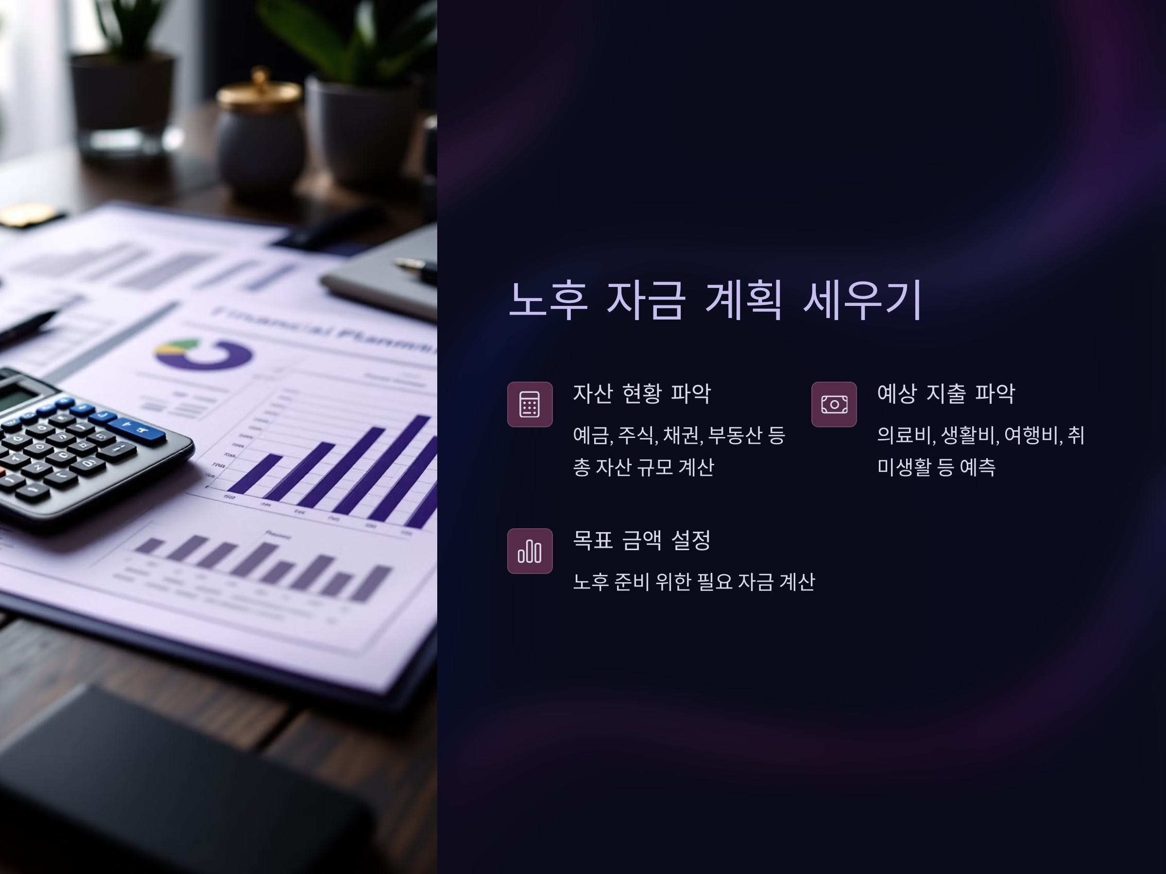 퇴직 시점에서 자신이 보유한 자산의 총액을 정확히 파악해야 합니다. 예를 들어, 예금, 주식, 채권, 부동산 등의 자산을 모두 합산하여 자신의 총 자산 규모를 알면, 노후 준비를 위한 목표 금액을 설정하기 쉬워집니다. 이를 바탕으로 필요한 자금을 계산할 수 있습니다.