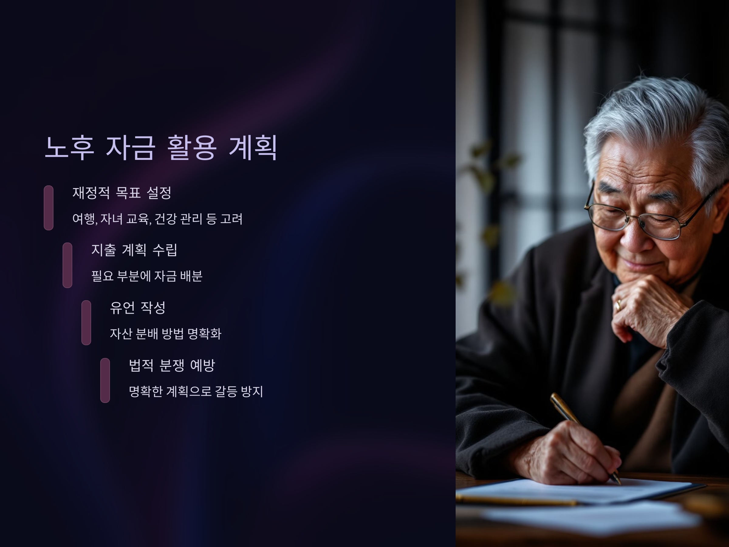 퇴직 후 자금을 활용하는 마지막 단계는, 어떻게 자금을 분배하고 활용할지에 대한 계획입니다. 이를 통해 남은 생애 동안 자금을 효율적으로 사용하는 방법을 찾을 수 있습니다. 또한, 자산 분배에 대한 계획을 세워 유언을 준비하는 것이 중요합니다.