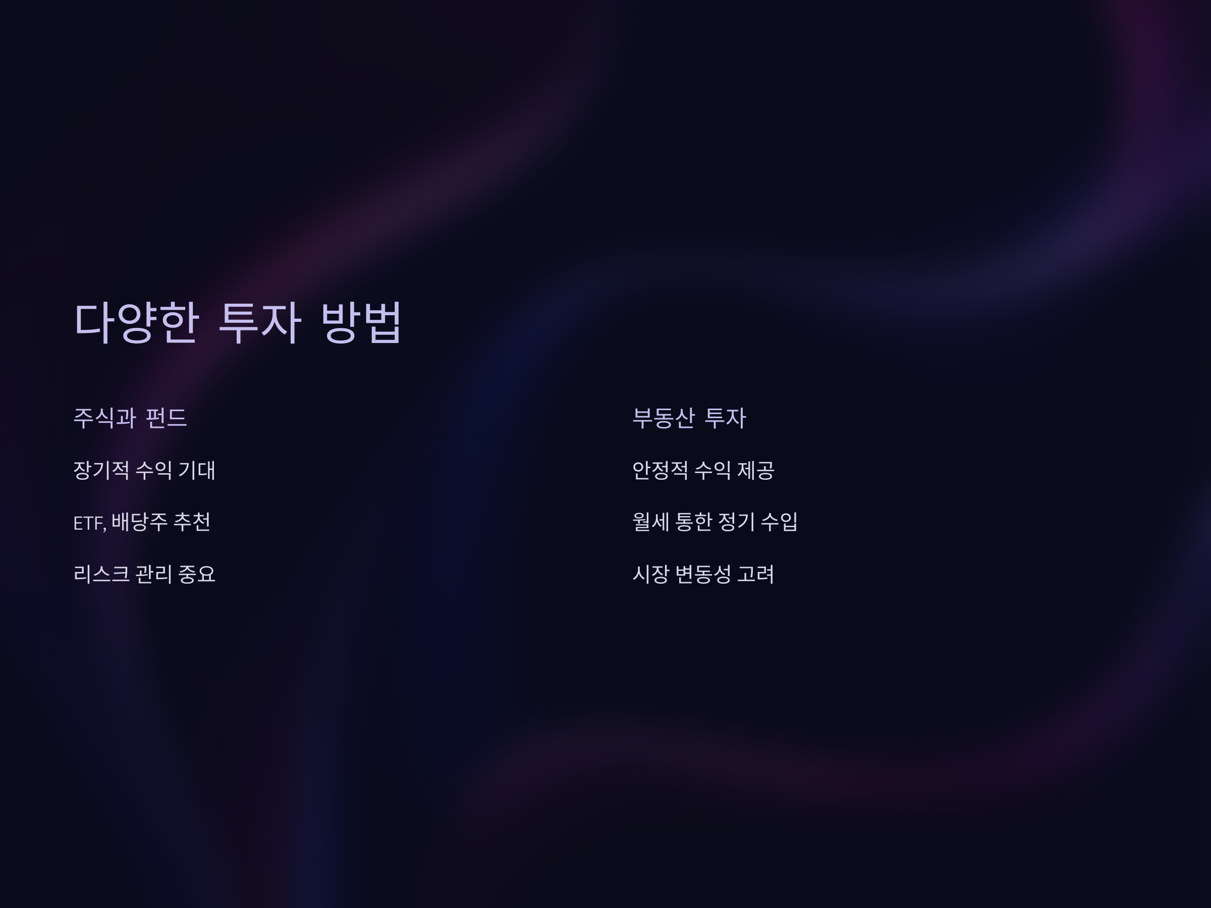부동산 투자는 비교적 안정적인 수익을 제공합니다. 퇴직 후 주택을 매도하거나, 월세를 통한 안정적인 수입을 얻는 방법을 고려할 수 있습니다. 다만, 부동산 시장의 변동성과 유지 관리 비용 등을 고려하여 신중히 결정해야 합니다.