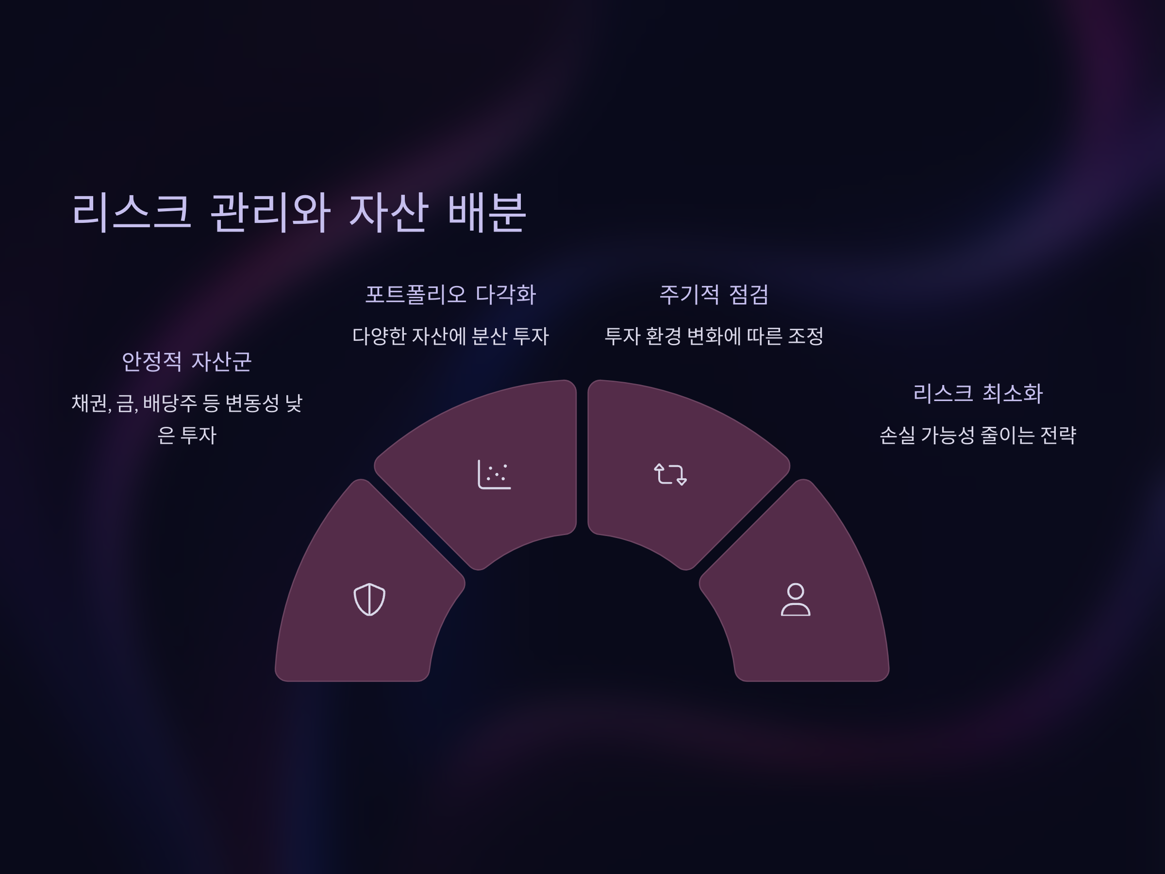 퇴직 후에는 안정적인 자산군에 집중하여 리스크를 줄이는 것이 필요합니다. 예를 들어, 채권, 금, 안정적인 배당주 등이 있습니다. 이들은 변동성이 적고, 안정적인 수익을 제공합니다.