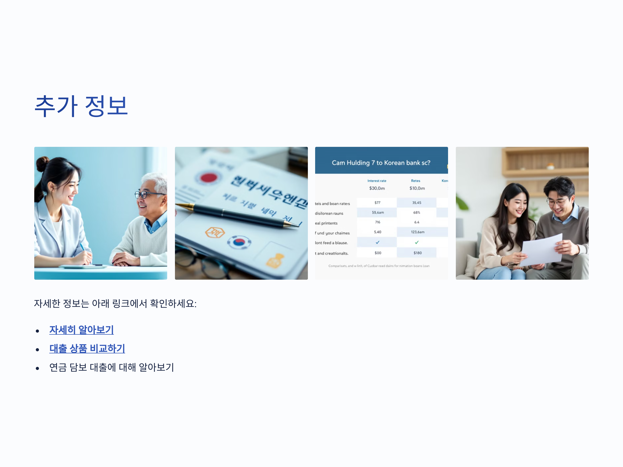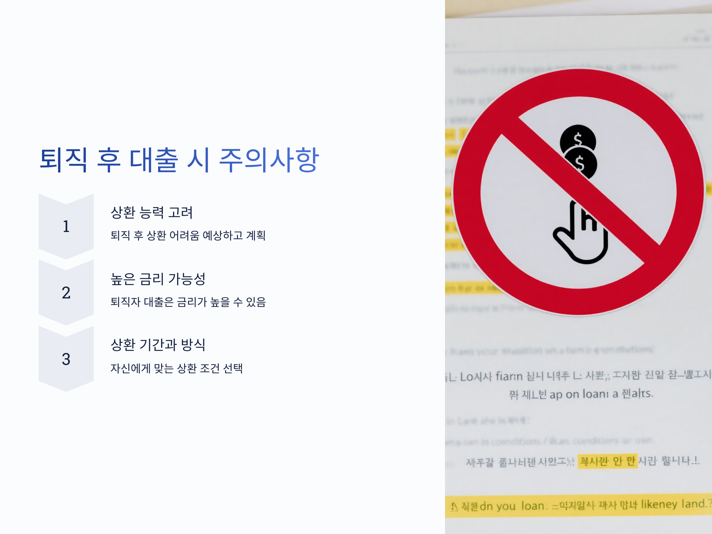 또한, 퇴직 후에는 소득이 감소할 수 있기 때문에 상환 계획을 철저히 세워야 합니다. 은행이나 금융기관은 대출자가 상환 능력이 있는지 철저히 검토하기 때문에, 상환 계획을 명확히 제시하는 것이 중요합니다.
