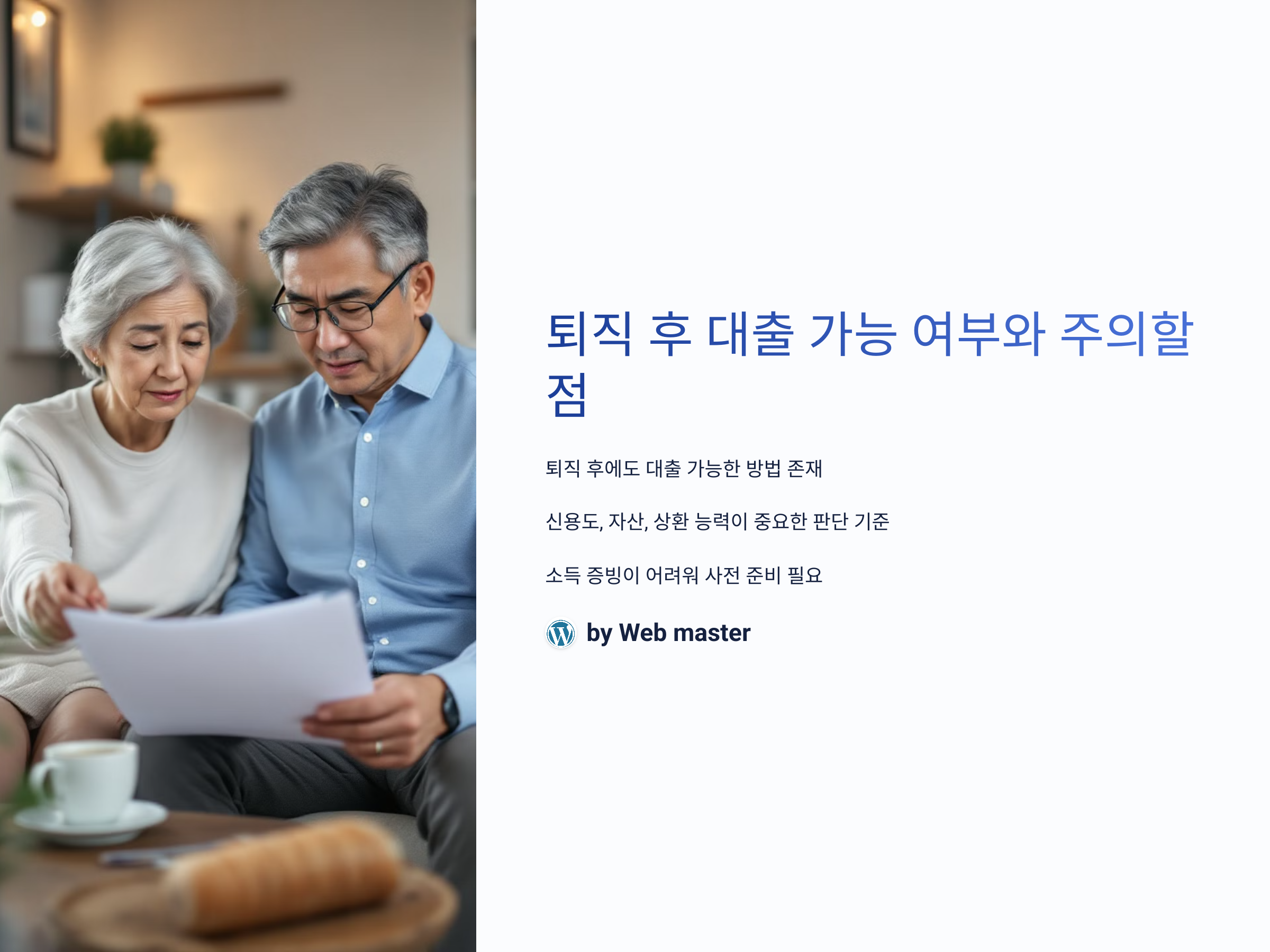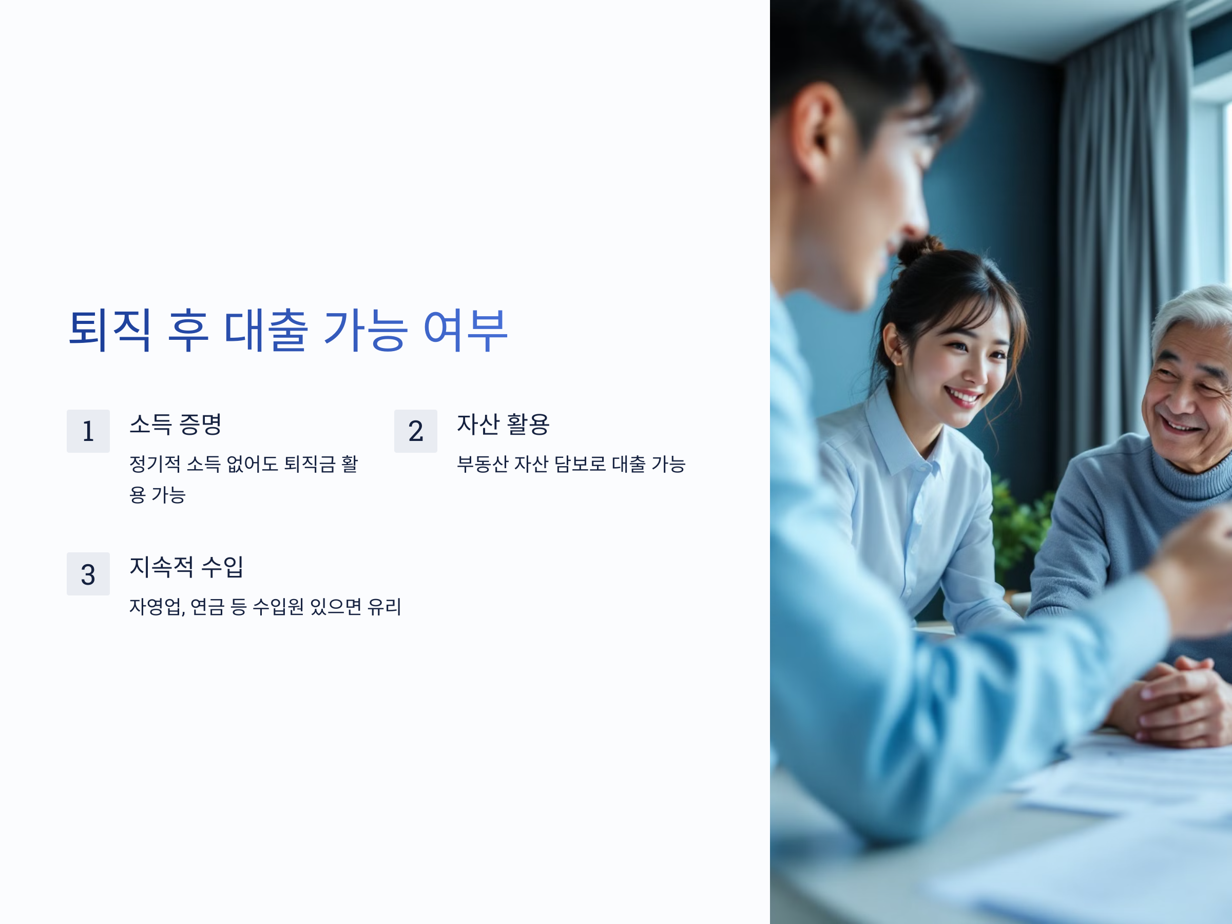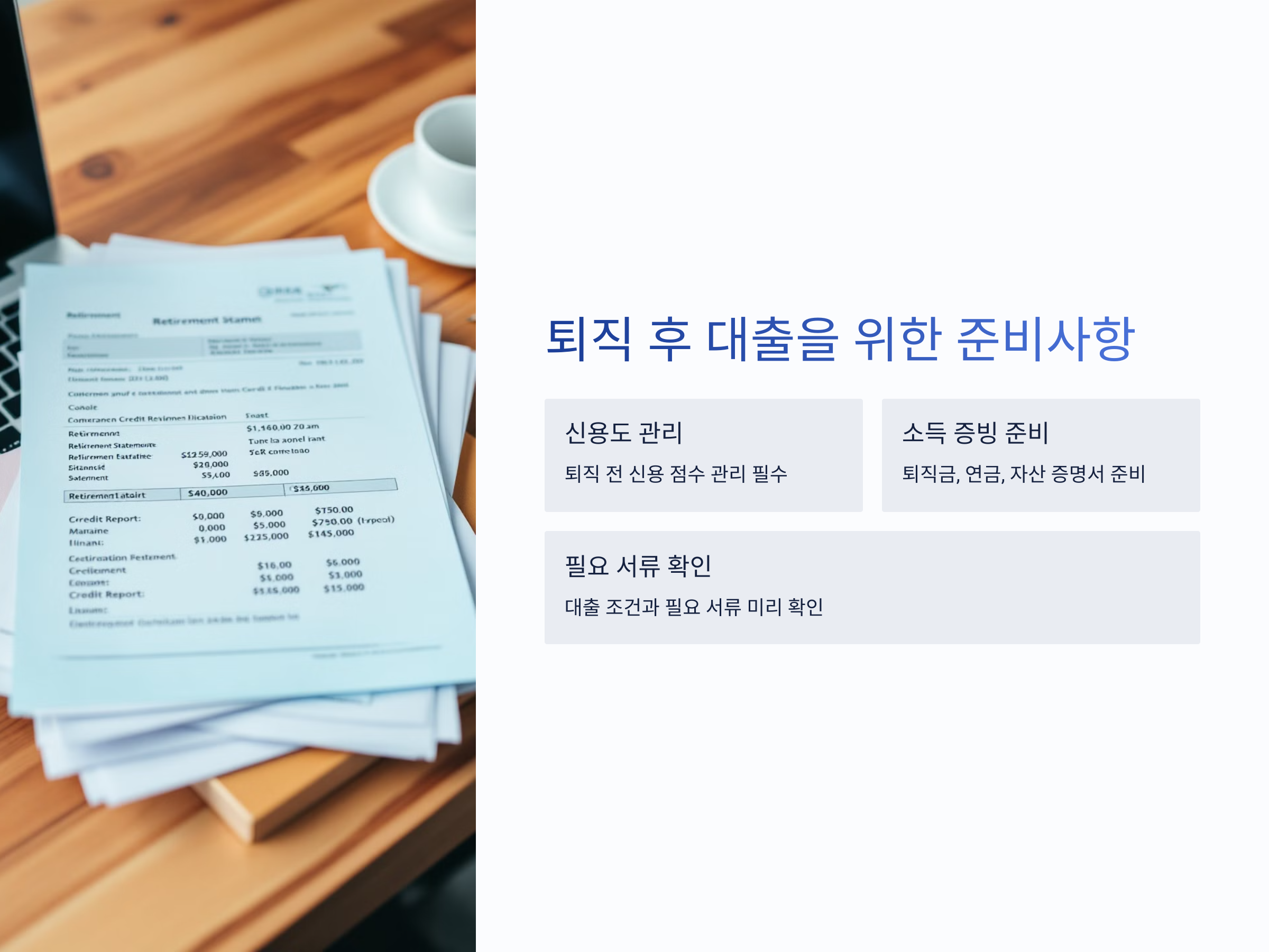 퇴직 후에는 소득 증빙이 어려울 수 있지만, 퇴직금 통장 내역, 연금 수령 내역, 자산 증명서 등을 통해 자신의 상환 능력을 입증할 수 있습니다. 또한, 대출을 받을 때 필요한 서류나 조건들을 미리 확인하고 준비하는 것이 대출 승인을 받는 데 중요한 역할을 합니다.
