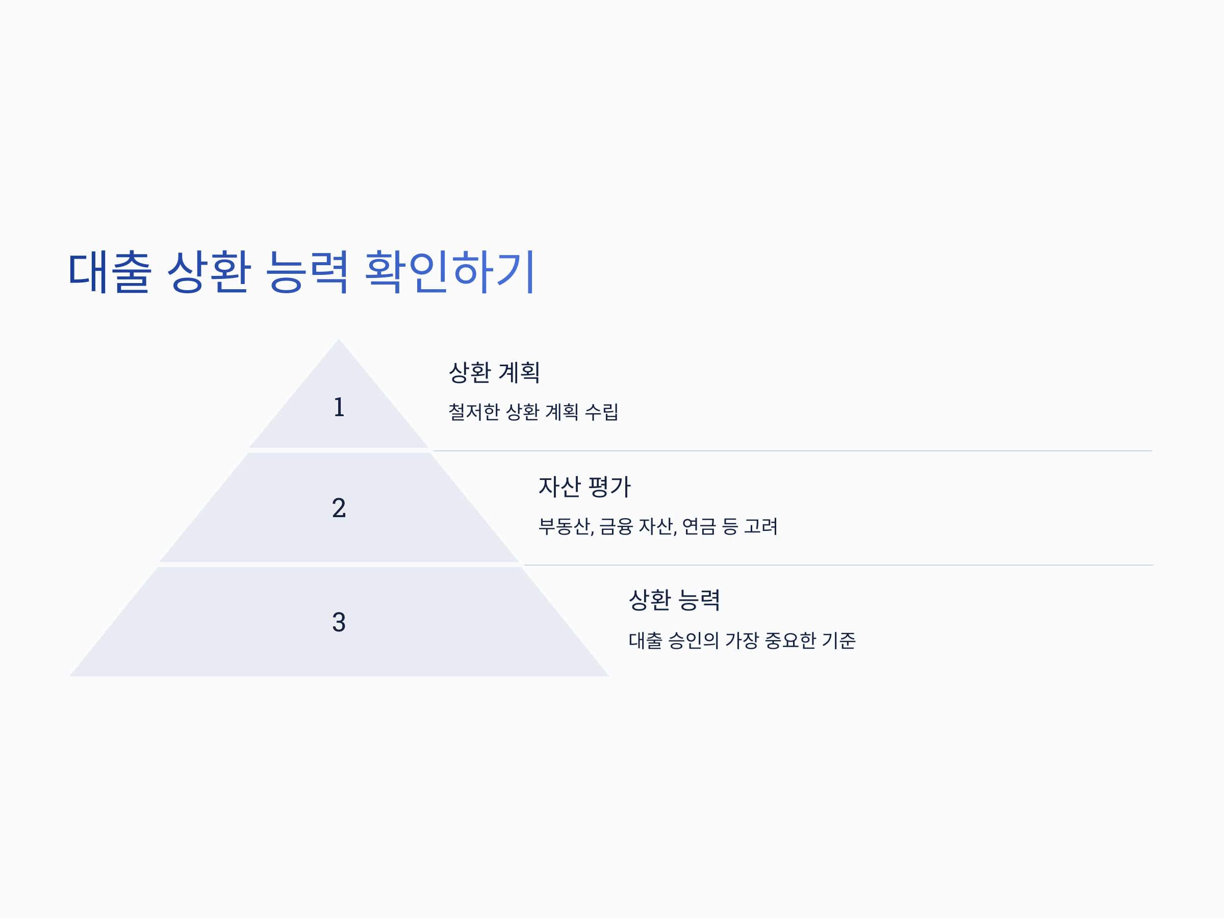 퇴직 후 대출을 받을 때 가장 중요한 점은 '상환 능력'입니다. 상환 능력은 대출자가 대출금을 상환할 수 있는 능력을 의미하는데, 이는 대출 승인의 중요한 기준이 됩니다. 퇴직 후 상환 능력을 증명하기 위해서는 퇴직금 외에도 부동산, 금융 자산, 연금 등 다양한 자산을 고려할 수 있습니다.