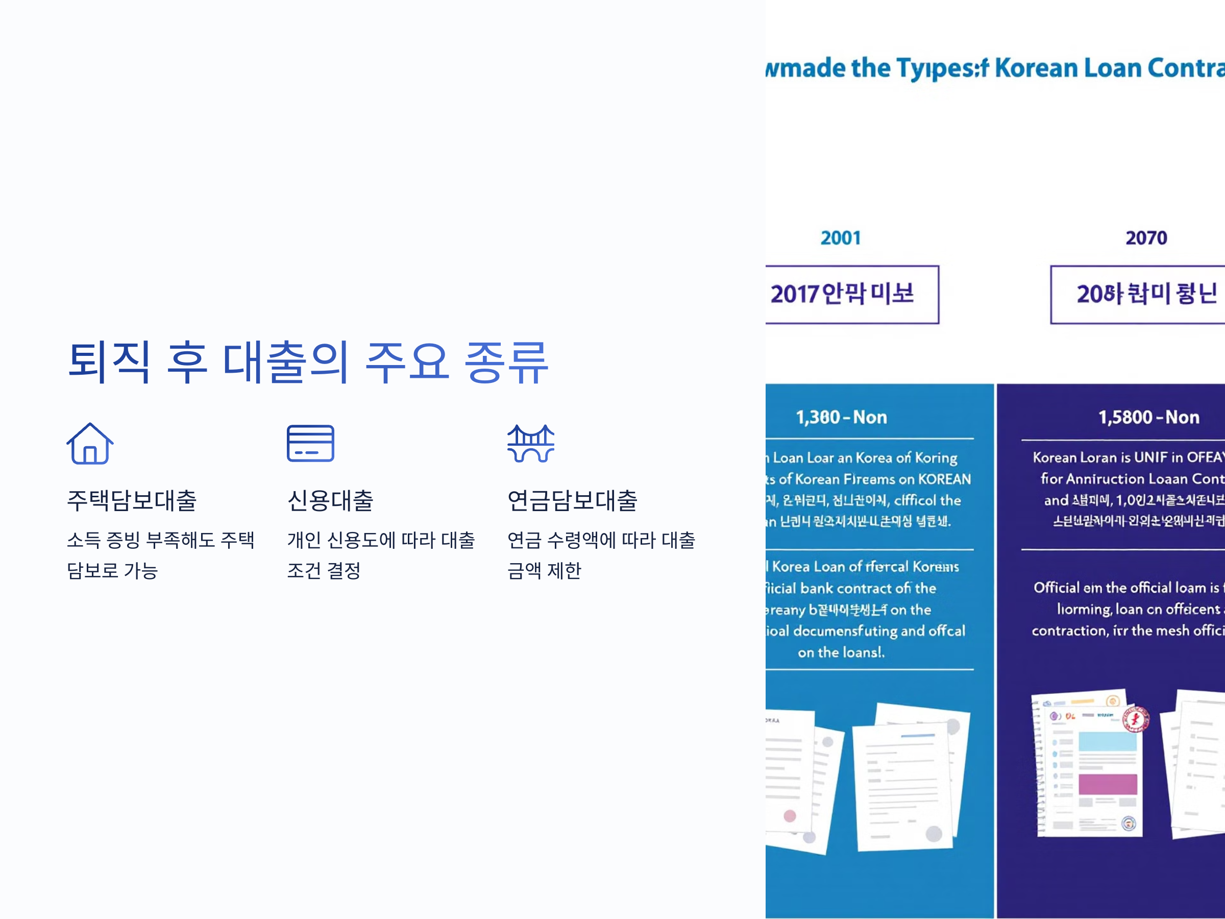 퇴직 후에도 이용할 수 있는 대출 상품은 다양합니다. 대표적인 대출 종류는 주택담보대출, 신용대출, 연금담보대출 등이 있습니다. 이 중에서 주택담보대출은 퇴직 후에도 여전히 많은 사람들이 이용하는 대출입니다. 주택을 담보로 대출을 받으면, 소득 증빙이 부족하더라도 대출을 받을 수 있습니다.