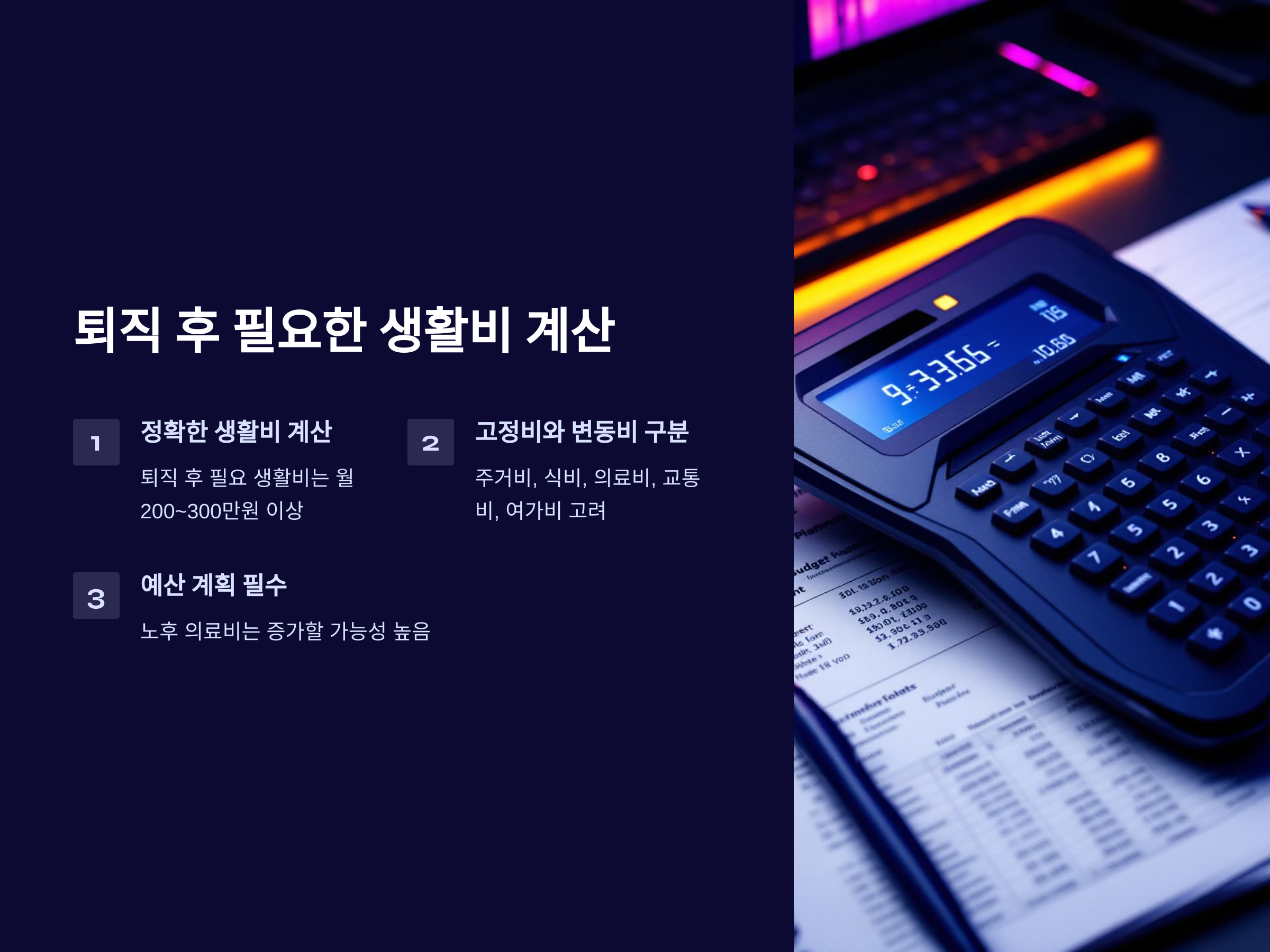 퇴직 후 돈 걱정을 없애기 위해 가장 먼저 해야 할 일은 필요한 생활비를 정확히 계산하는 것입니다. 많은 사람들이 퇴직 후에도 월급을 받을 때처럼 생활비를 지출하는 경향이 있는데, 이는 위험할 수 있습니다. 퇴직 후의 생활비는 현역 시절보다 줄어들 수 있지만, 의료비 등 새로운 지출이 발생할 가능성이 높기 때문입니다.