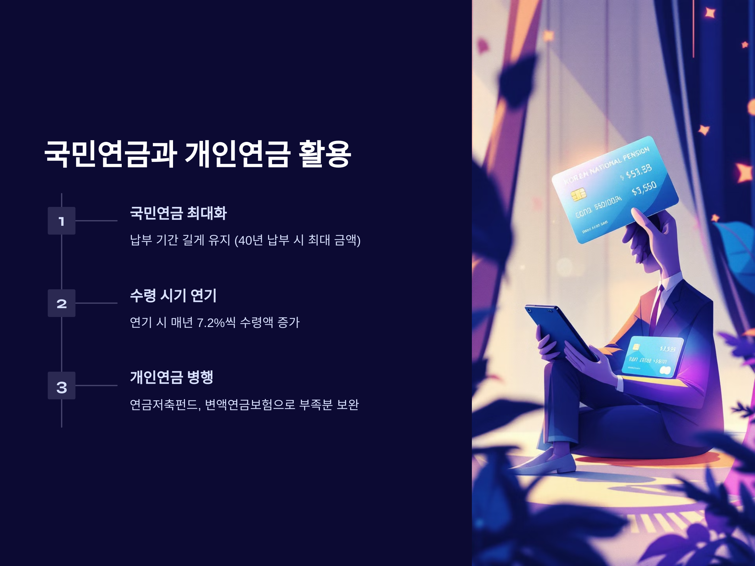 - 조기 연금 수령보다 연기 연금 선택: 국민연금은 65세부터 수령 가능하지만, 연기하면 매년 7.2%씩 더 받을 수 있음