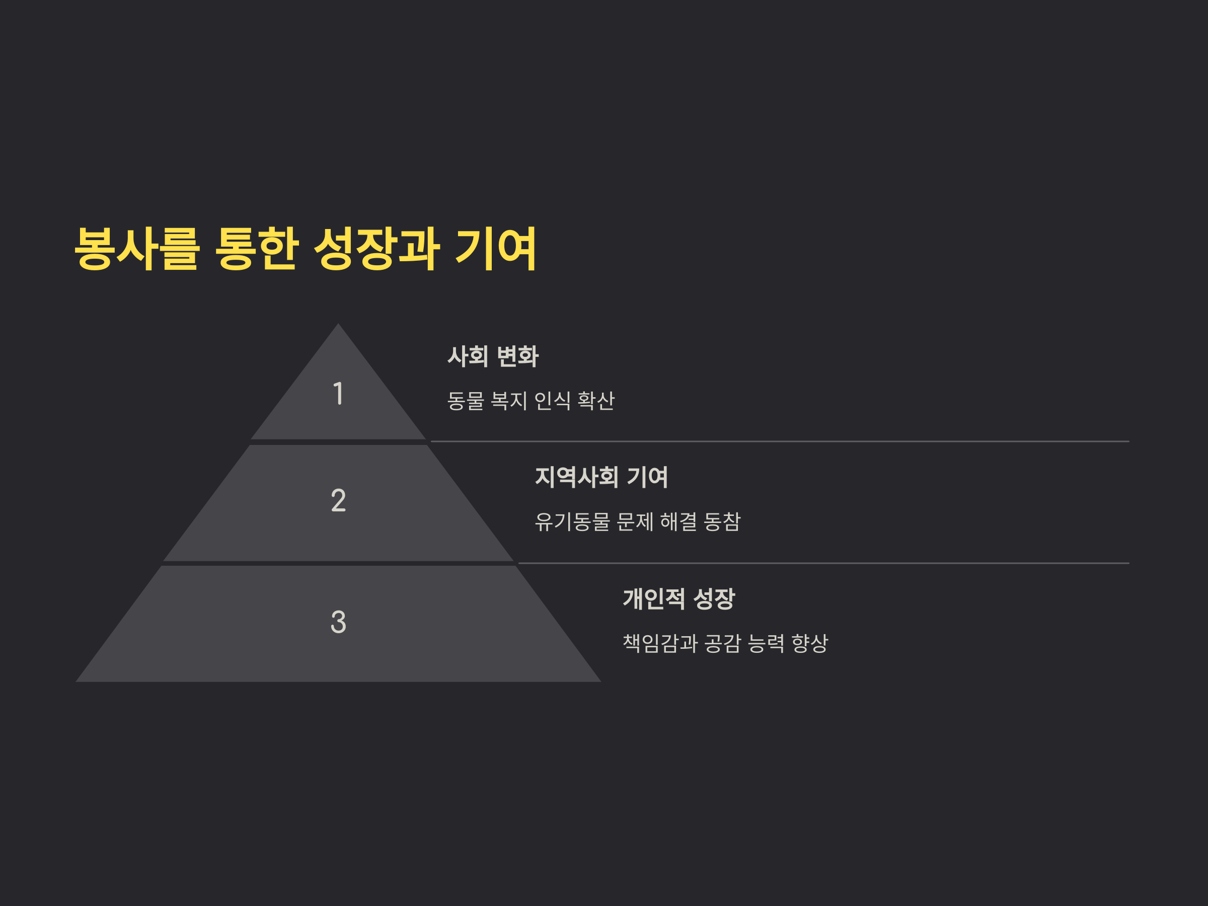 동물 보호 봉사 활동은 개인의 성장과 사회적 기여를 동시에 이룰 수 있는 활동입니다. 봉사자들은 책임감과 공감 능력을 기를 수 있으며, 반려동물에 대한 이해를 높일 수 있습니다. 또한, 생명을 존중하는 마음가짐을 배우는 계기가 될 수 있습니다. 사회적으로는 유기동물 문제를 해결하는 데 기여하고, 동물 복지에 대한 인식을 확산시키는 역할을 합니다. 이러한 활동을 통해 더 나은 사회를 만드는 데 동참할 수 있습니다.