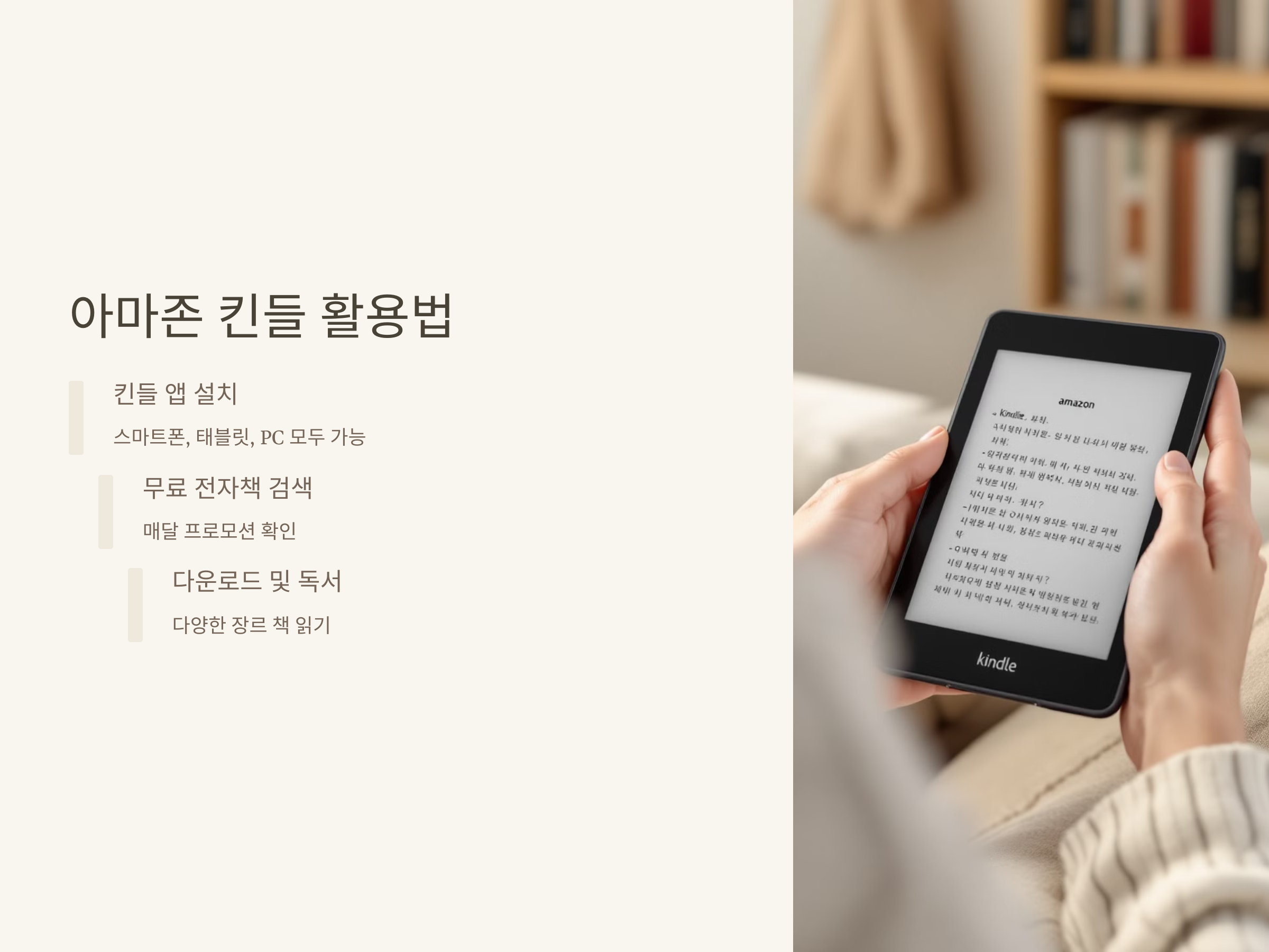 특히, 퇴직 후 시간을 보내기 위해 새로운 분야를 공부하고자 하는 분들에게는 다양한 전자책을 통해 유용한 지식을 얻을 수 있는 좋은 기회입니다. 킨들 앱을 통해 스마트폰, 태블릿, PC에서 쉽게 책을 읽을 수 있어 언제 어디서든 독서가 가능합니다.