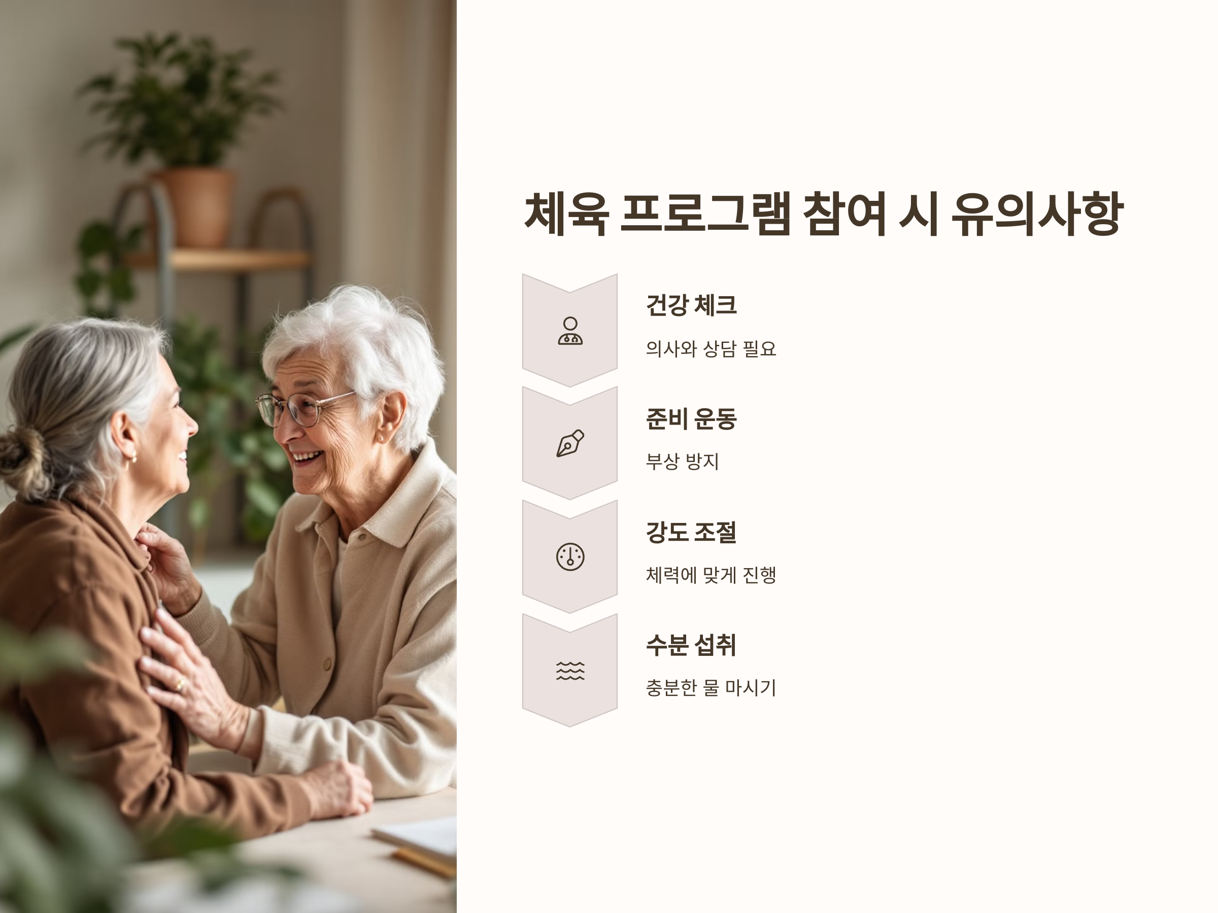 모든 운동은 자신의 체력에 맞게 진행하는 것이 중요합니다. 무리한 운동은 오히려 건강에 해로울 수 있기 때문에, 체육 프로그램에 참여할 때 강도를 조절하는 것이 중요합니다. 각 프로그램의 난이도와 강도를 미리 파악하고, 적절한 수준에서 운동을 시작하는 것이 좋습니다.