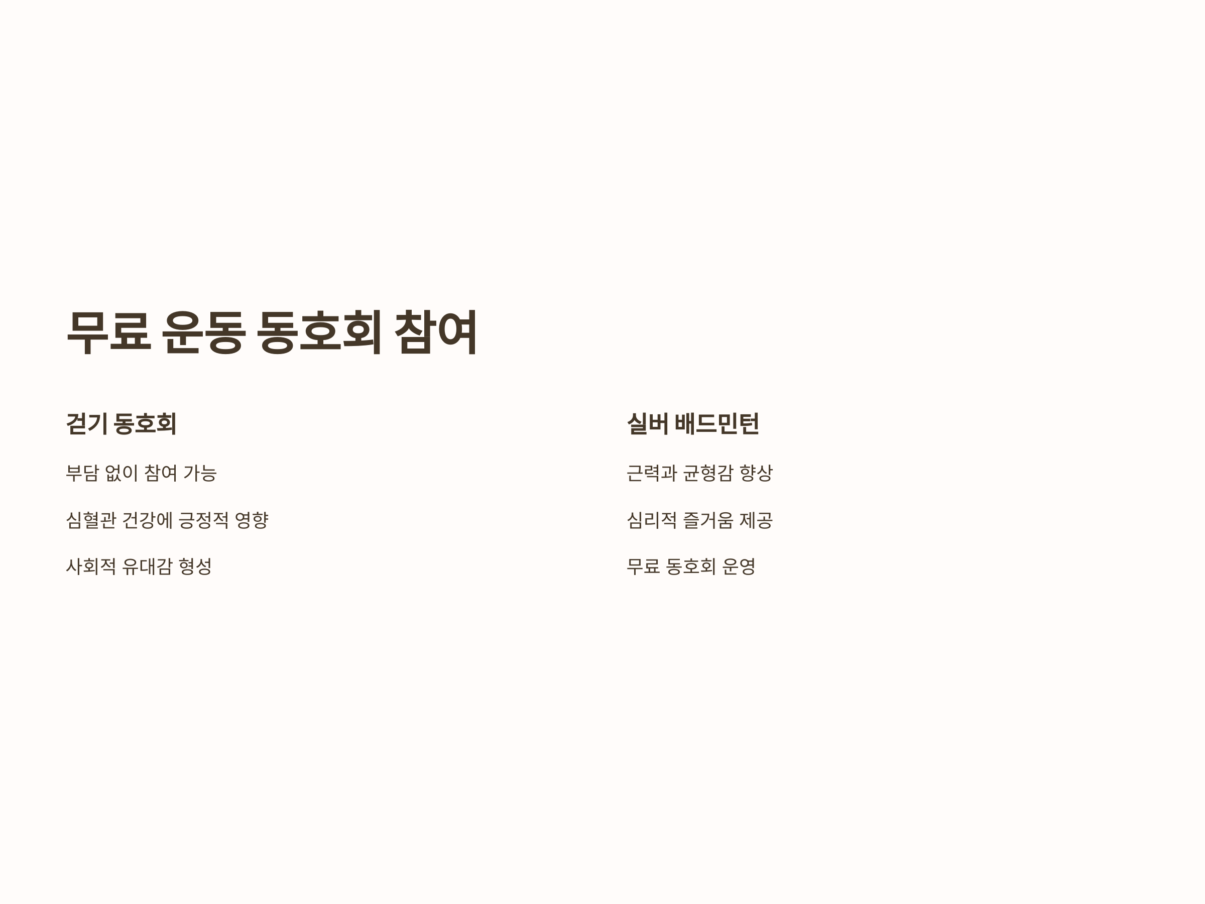실버 배드민턴은 빠른 속도의 운동을 피하면서도 체력 증진에 도움을 주는 스포츠입니다. 배드민턴은 근력과 균형감을 기를 수 있으며, 심리적으로도 즐거움을 주는 운동입니다. 일부 지역에서는 실버 배드민턴 동호회를 무료로 운영하고 있으므로 관심 있는 노인들이 적극적으로 참여할 수 있습니다.