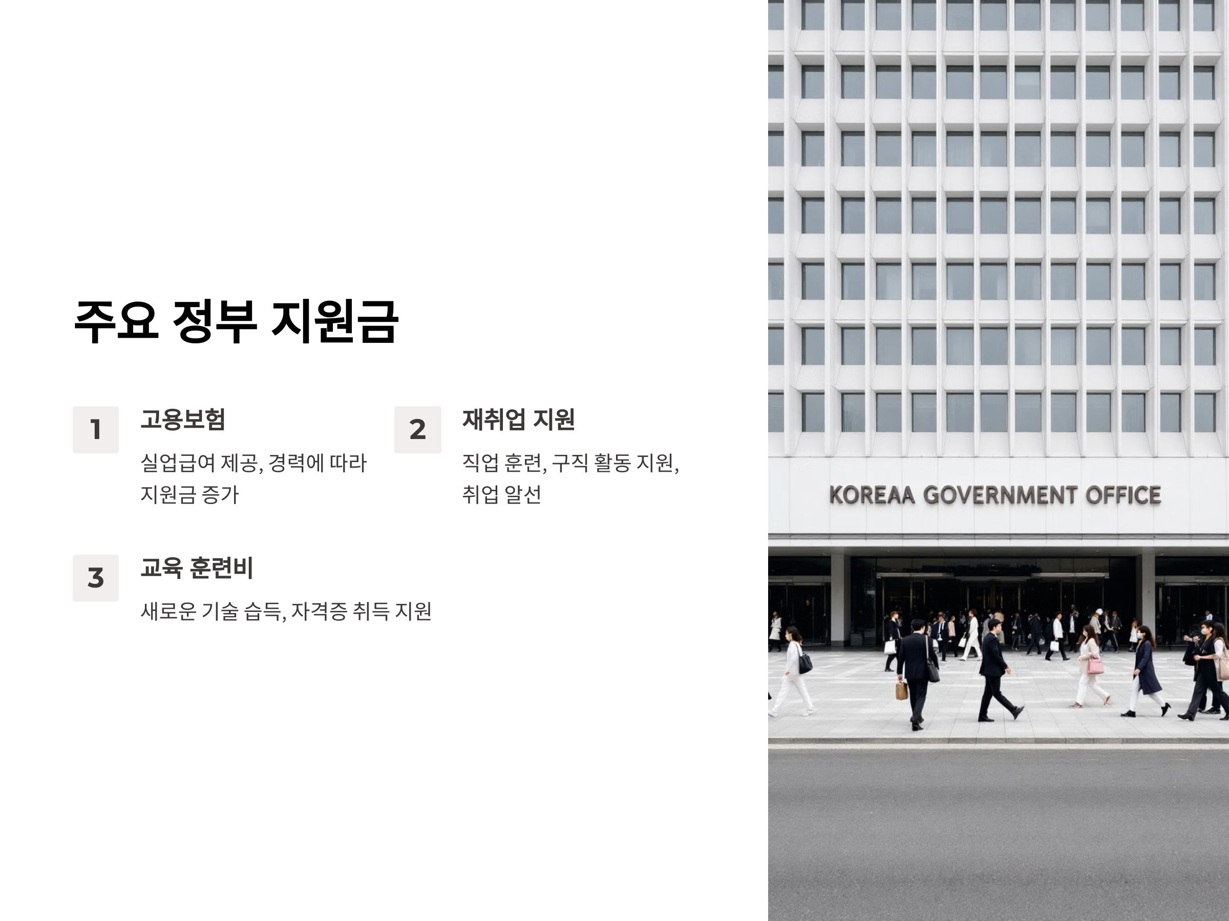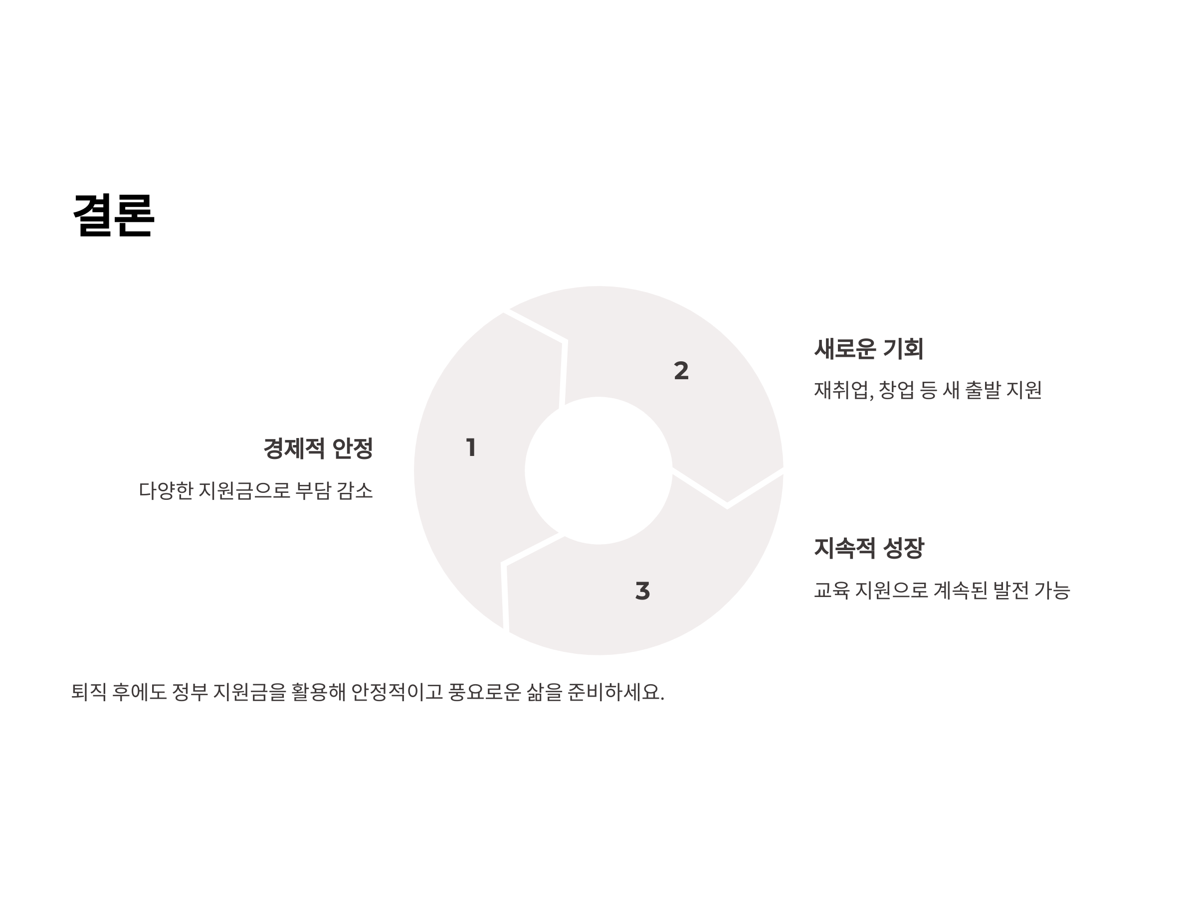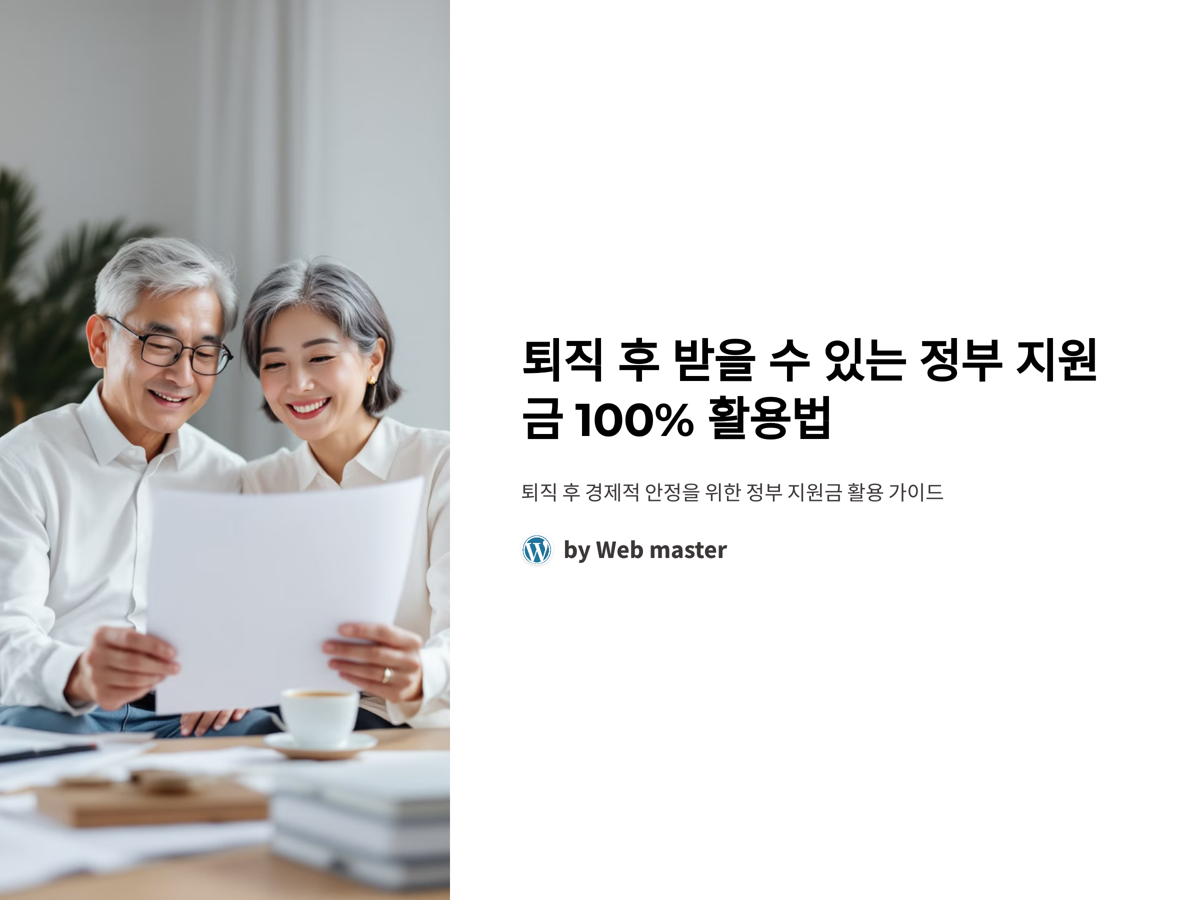 퇴직 후 경제적 안정을 유지하기 위해서는 정부에서 제공하는 다양한 지원금을 최대한 활용하는 것이 중요합니다. 고용보험, 재취업 지원, 교육 훈련비, 창업 지원금 등을 잘 활용하면 퇴직 후에도 안정적인 삶을 유지할 수 있습니다. 지원금은 각자의 상황에 맞게 적절히 신청하고 활용하는 것이 핵심입니다.