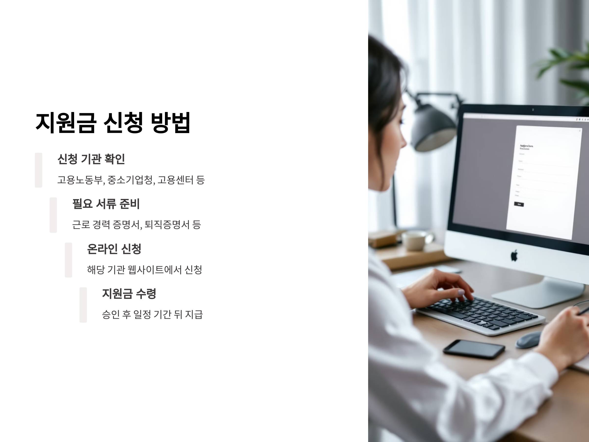 각 정부 지원금은 고용노동부, 중소기업청, 고용센터 등을 통해 신청할 수 있습니다. 보통 온라인 신청이 가능하며, 본인의 상황에 맞는 지원금을 선택해 신청하면 됩니다. 신청 시에는 근로 경력 증명서, 퇴직증명서 등 필요한 서류를 준비해야 하며, 일부 지원금은 면담을 통해 지원 자격을 확인하기도 합니다.