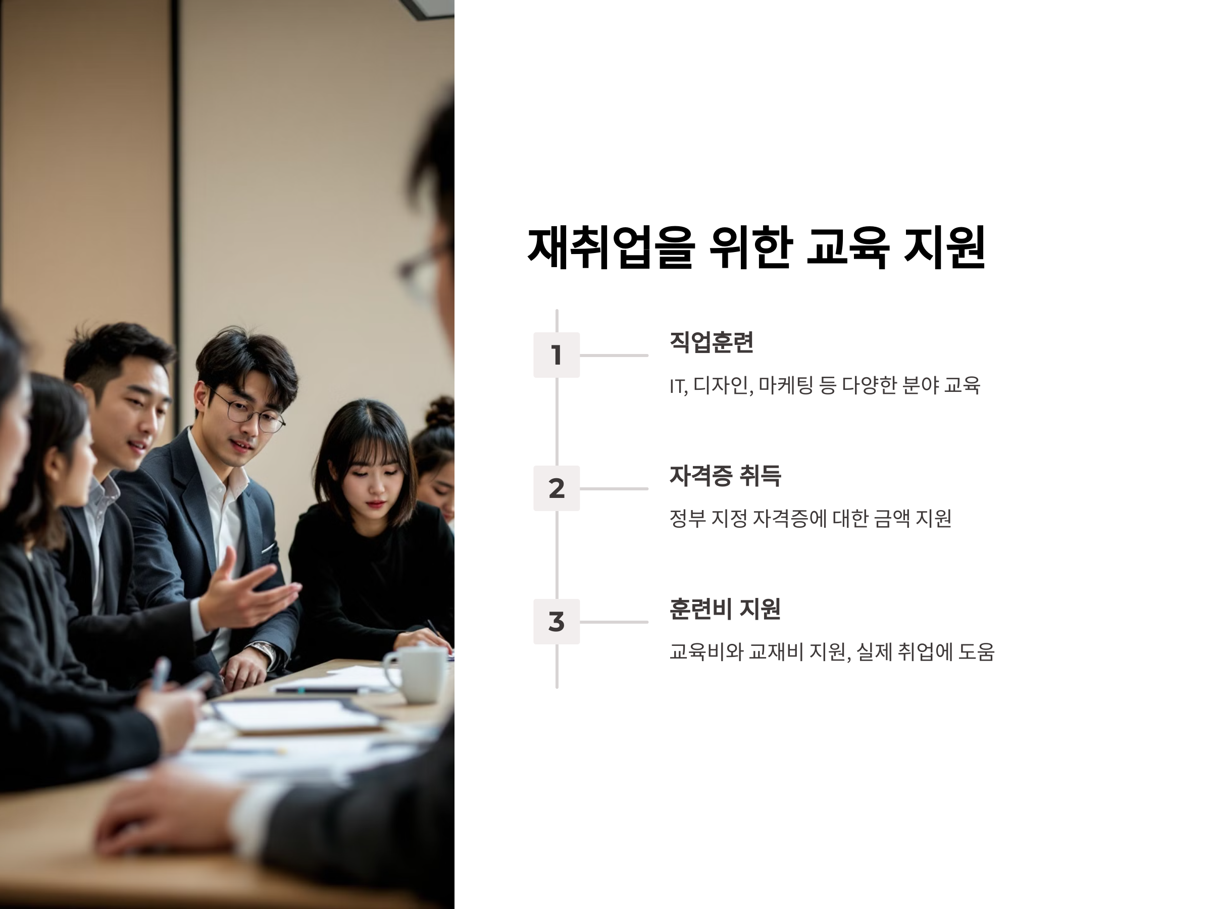 정부는 퇴직 후 재취업을 원하는 사람들을 위해 다양한 재취업 지원 프로그램을 운영하고 있습니다. 특히 취업 지원을 위한 직업 훈련, 구직 활동 지원, 취업 알선 등을 받을 수 있습니다. 이 과정에서 지원금이 지급되기도 하며, 구직활동을 통해 취업이 결정되면 추가적인 지원을 받을 수 있는 기회도 존재합니다.
