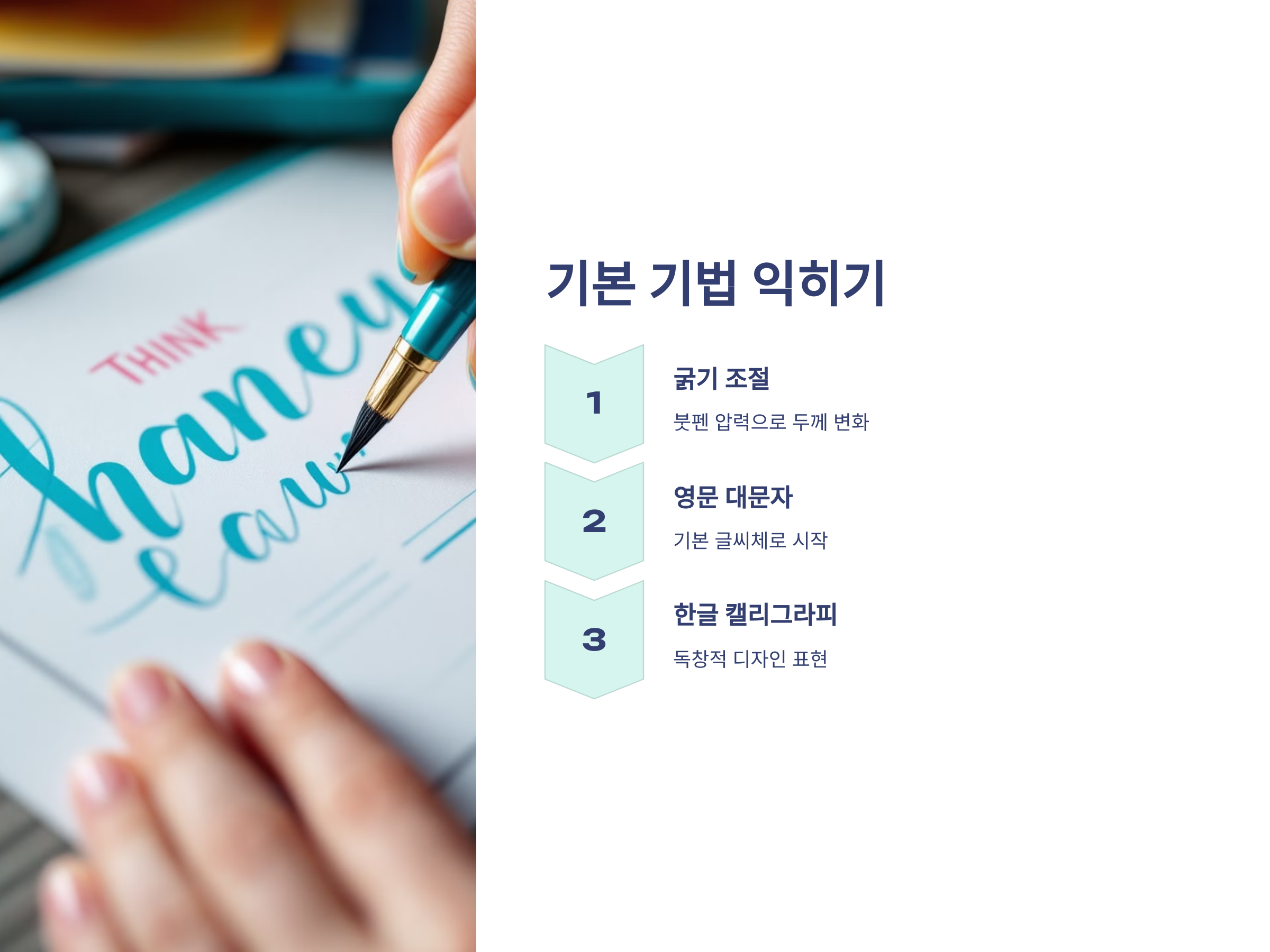 캘리그라피에서 가장 중요한 기법은 ‘굵기 조절’입니다. 붓펜을 사용하여 글씨의 두께를 조절하는 방법을 배우는 것이 기본 중의 기본입니다. 붓펜을 눌러서 쓰는 부분은 굵고, 가볍게 쓸 때는 얇아지게 되며, 이를 통해 다양한 스타일의 글씨를 쓸 수 있습니다.