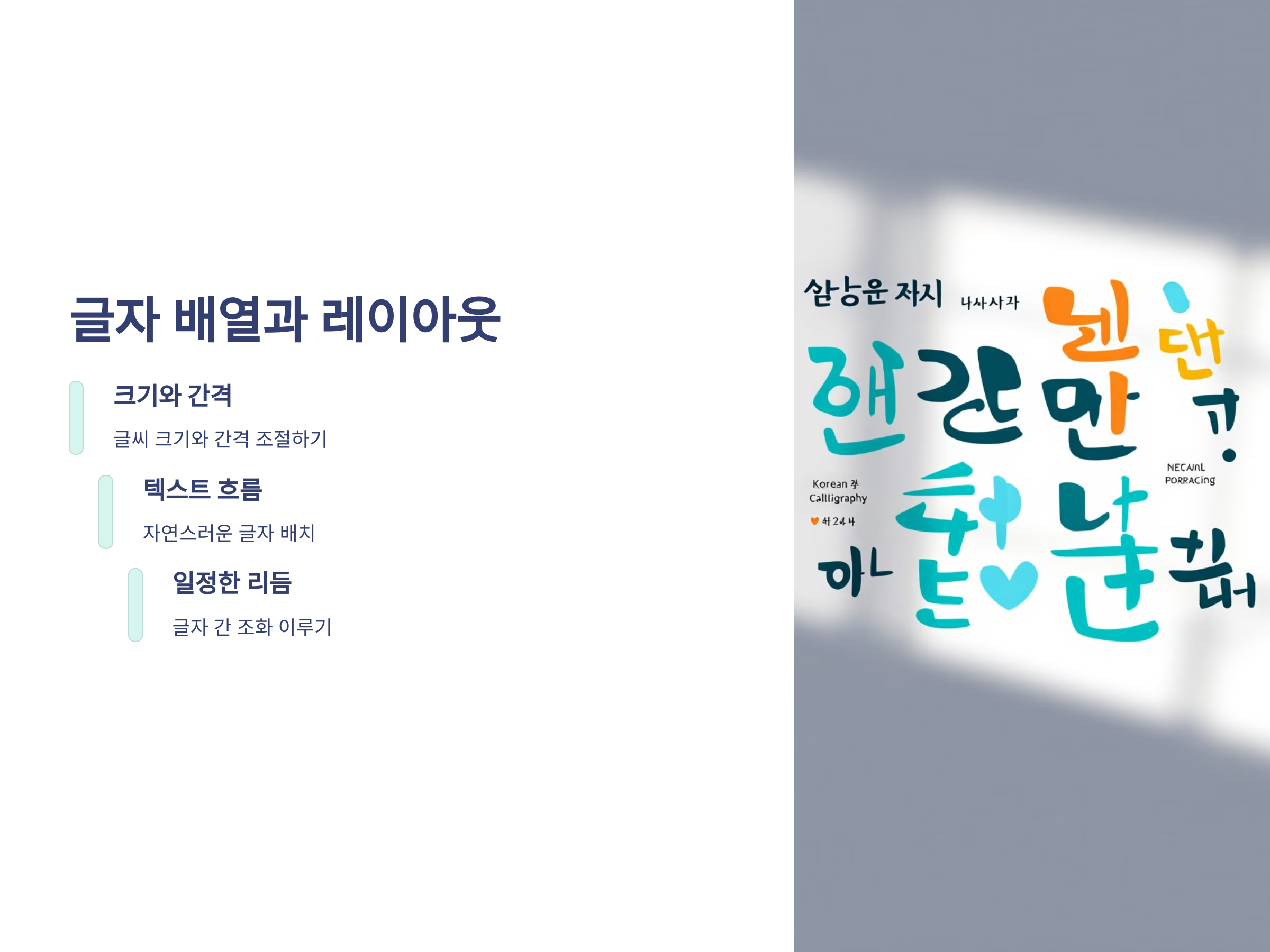 캘리그라피에서 중요한 또 다른 요소는 글자의 배열과 레이아웃입니다. 글씨의 크기, 간격, 정렬 등을 고려하여 종이에 적절히 배치하는 것이 중요합니다. 기본적인 글씨를 잘 쓸 수 있다면, 이제 그 글자들을 어떻게 아름답게 배열할 것인지 고민해야 합니다.