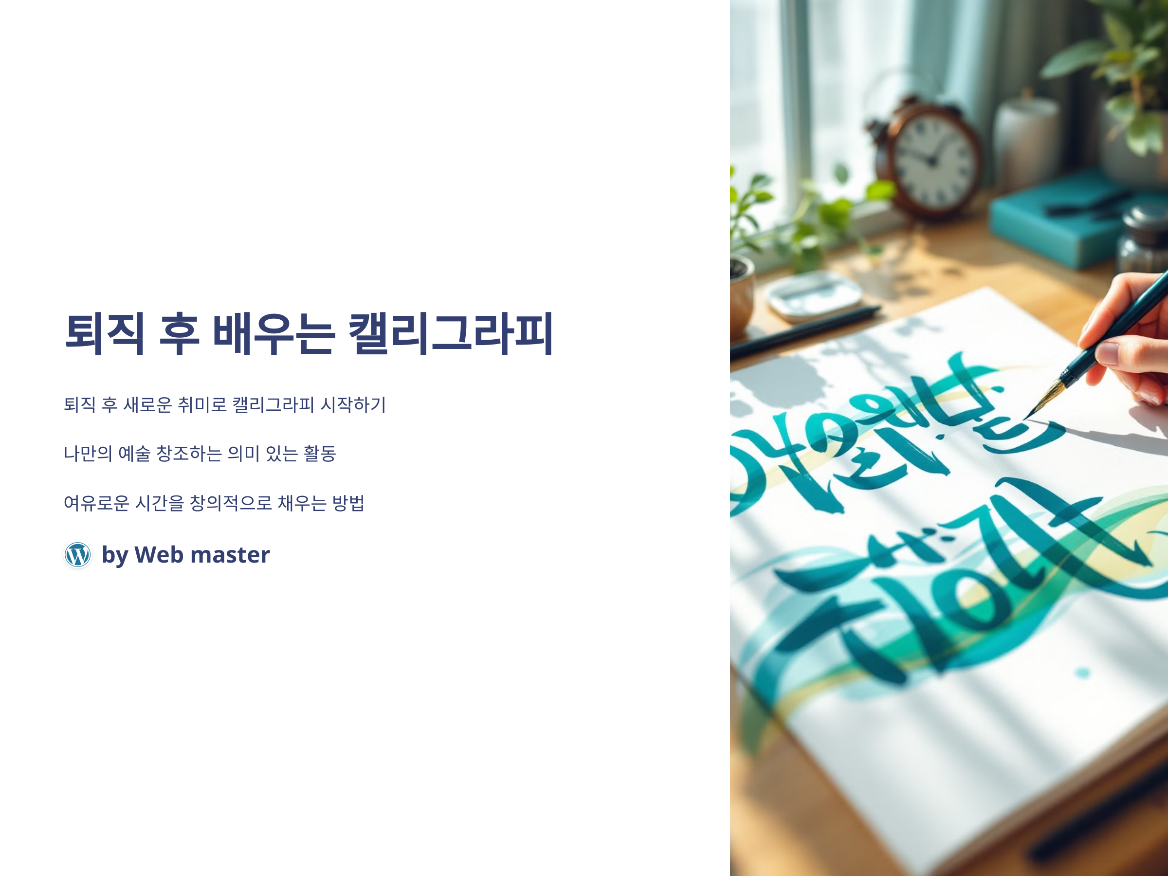 퇴직 후에는 새로운 취미를 찾는 많은 사람들이 있습니다. 그런 분들에게 캘리그라피는 매우 매력적인 선택이 될 수 있습니다. 캘리그라피는 단순한 글씨를 넘어서, 나만의 예술을 창조하는 과정이기 때문에, 퇴직 후 여유로운 시간을 의미 있는 취미로 채우기에 완벽한 활동입니다. 이번 강의에서는 캘리그라피의 기초부터 시작해서, 단계별로 어떻게 시작하고 발전할 수 있는지 소개하겠습니다.