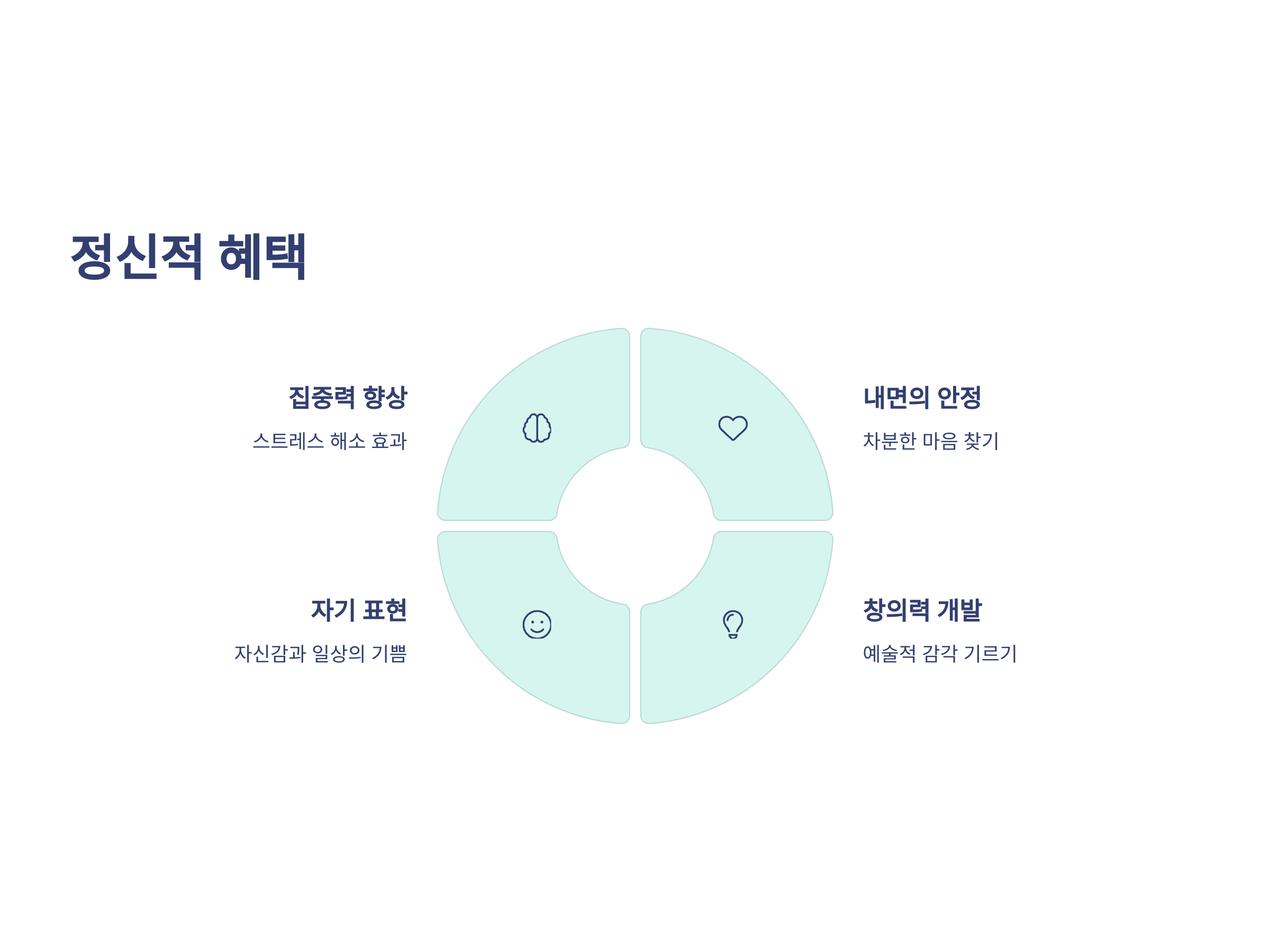 캘리그라피를 배우는 동안 정신적으로 많은 혜택을 얻을 수 있습니다. 첫째, 캘리그라피는 매우 집중력을 요하는 작업입니다. 따라서 스트레스 해소와 집중력 향상에 큰 도움이 됩니다. 또한, 손글씨를 쓰는 과정은 나만의 속도로 차분히 진행되기 때문에 마음이 편안해지고, 내면의 안정감을 찾을 수 있습니다.