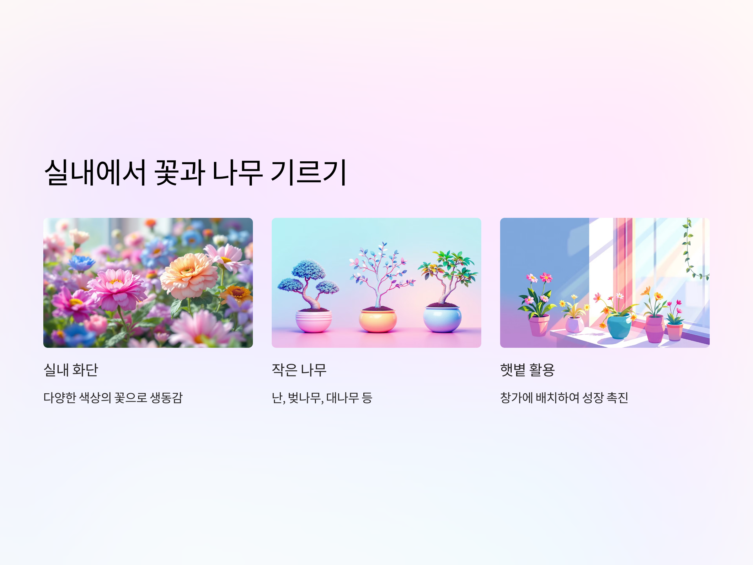 꽃과 나무를 실내에서 기르는 것은 집안을 더욱 아름답고 화사하게 만들어 줍니다. 다양한 꽃을 키울 수 있는 계절에는 실내 화단을 꾸미는 것도 좋은 아이디어입니다. 다양한 색상의 꽃을 배치하거나, 실내에서 자라는 작은 나무를 두면 공간에 생동감을 더할 수 있습니다. 특히 꽃은 그 자체로 아름다움과 향기를 제공할 뿐만 아니라, 시각적으로도 사람들에게 긍정적인 영향을 미칩니다.
