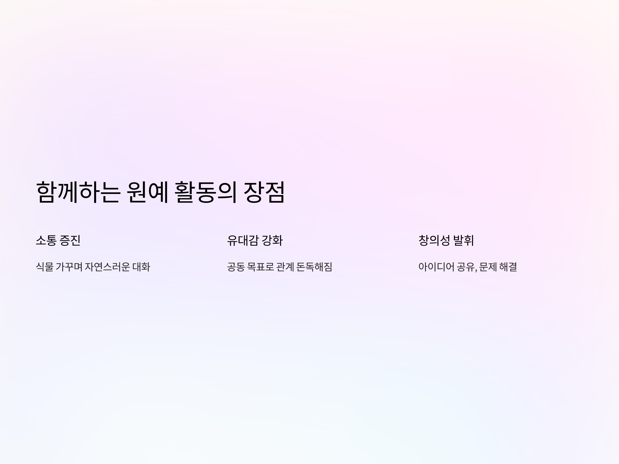 원예 활동은 단순히 즐거운 취미일 뿐만 아니라, 창의성과 문제 해결 능력을 기를 수 있는 기회를 제공합니다. 서로 다른 아이디어를 공유하고, 어떻게 식물을 잘 기를지에 대해 논의하며 함께 해결책을 찾아가는 과정은 매우 흥미롭고 유익합니다. 또한, 원예 활동을 통해 얻은 성취감은 일상에 활력을 불어넣어 줍니다.