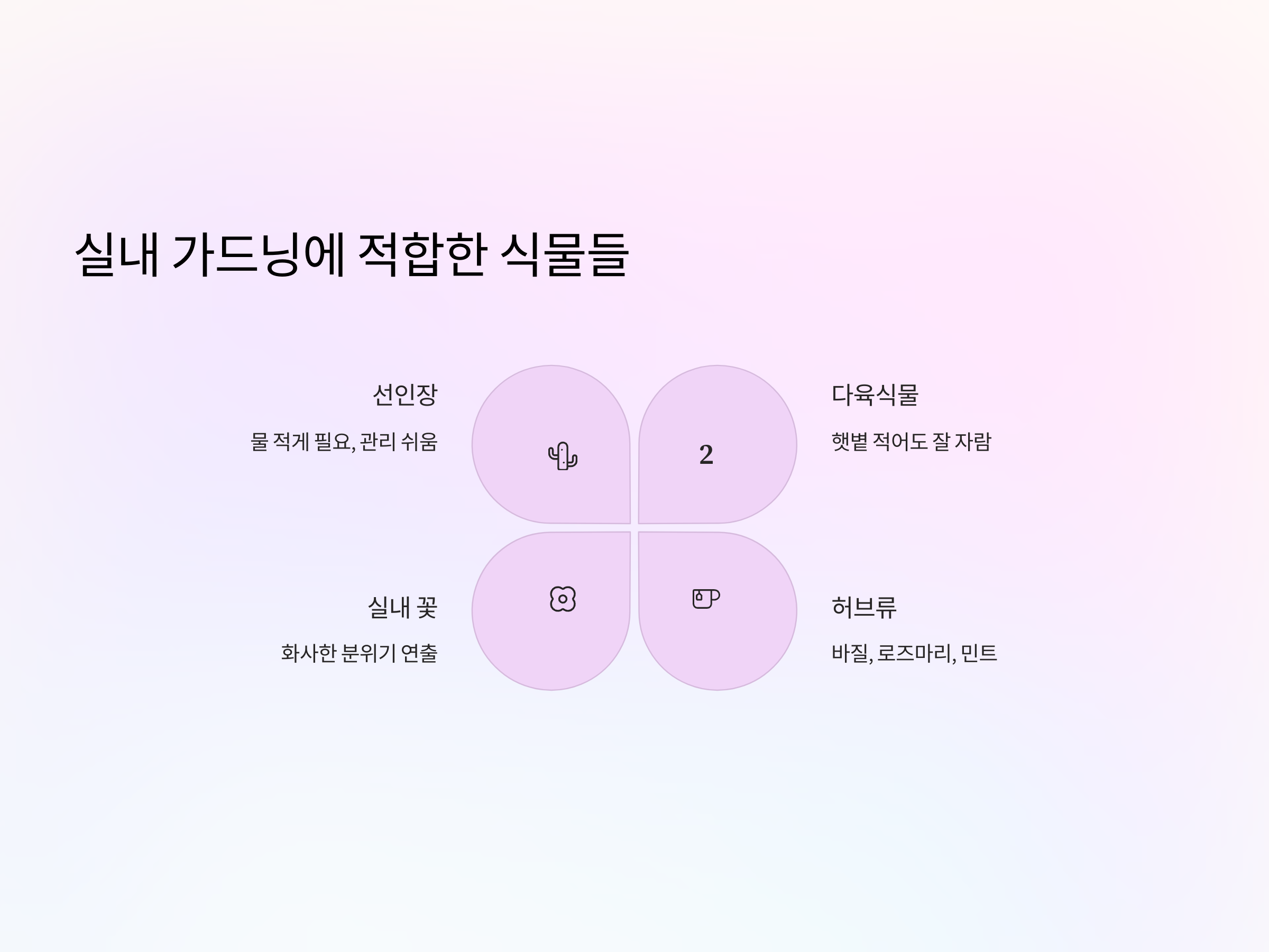 실내 가드닝을 시작하는 데 있어 가장 중요한 점은 관리하기 쉬운 식물부터 시작하는 것입니다. 초기에는 성장 속도가 빠르고, 적은 물과 햇볕으로도 잘 자라는 식물들로 시작하는 것이 좋습니다. 대표적으로 선인장, 다육식물, 허브류 등이 있으며, 이들은 관리가 간단하고 실내에서도 잘 자라는 특성을 가지고 있습니다.