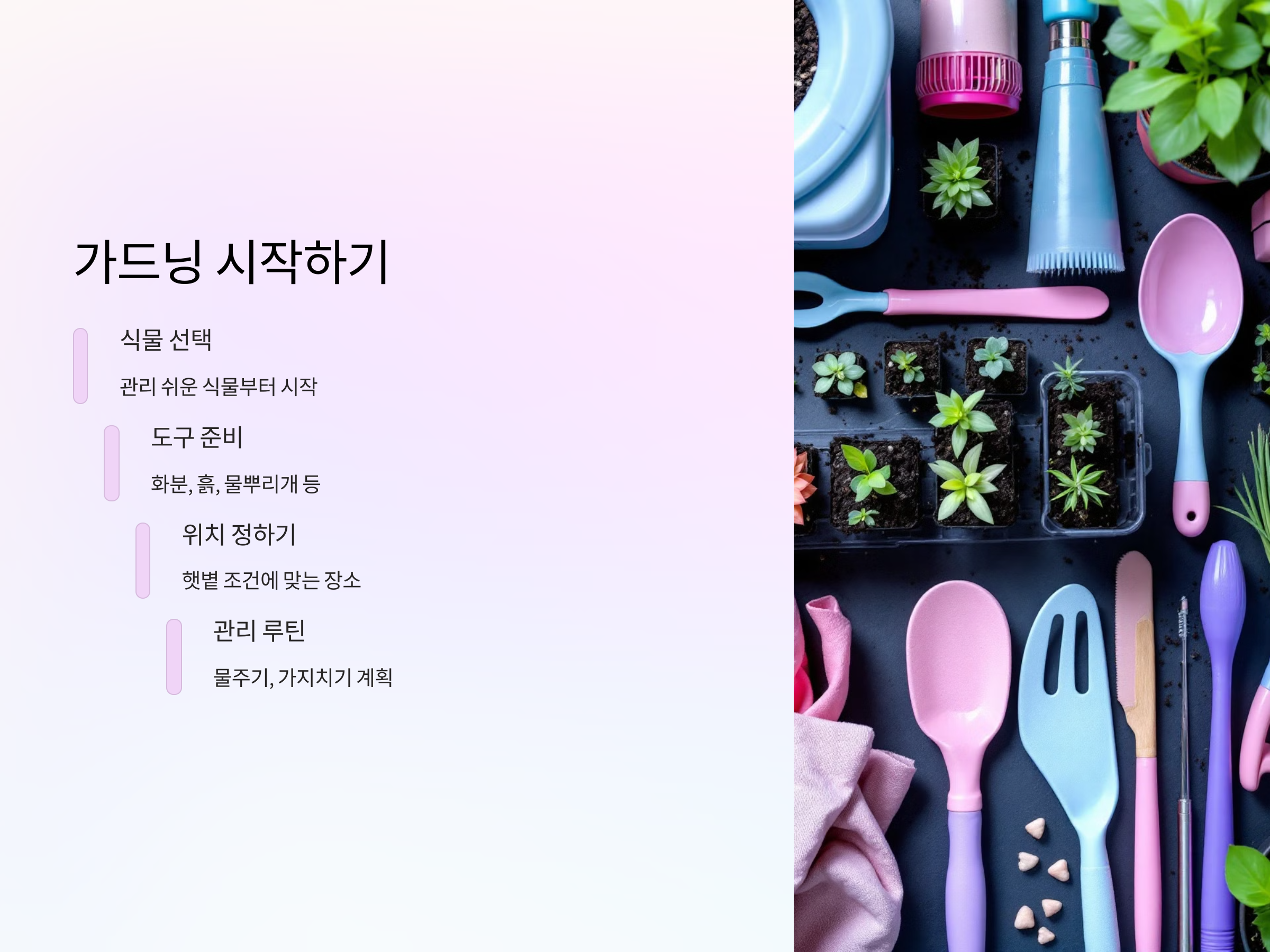 실내 가드닝을 시작하려면 무엇보다 자신이 관리할 수 있는 적합한 식물을 선택하는 것이 중요합니다. 이때 너무 까다로운 식물보다는 관리가 쉬운 식물을 선택하는 것이 좋습니다. 예를 들어, 스투키, 산세베리아, 페페로미아, 알로카시아 등은 실내에서도 잘 자라며 관리가 간단한 식물들입니다.