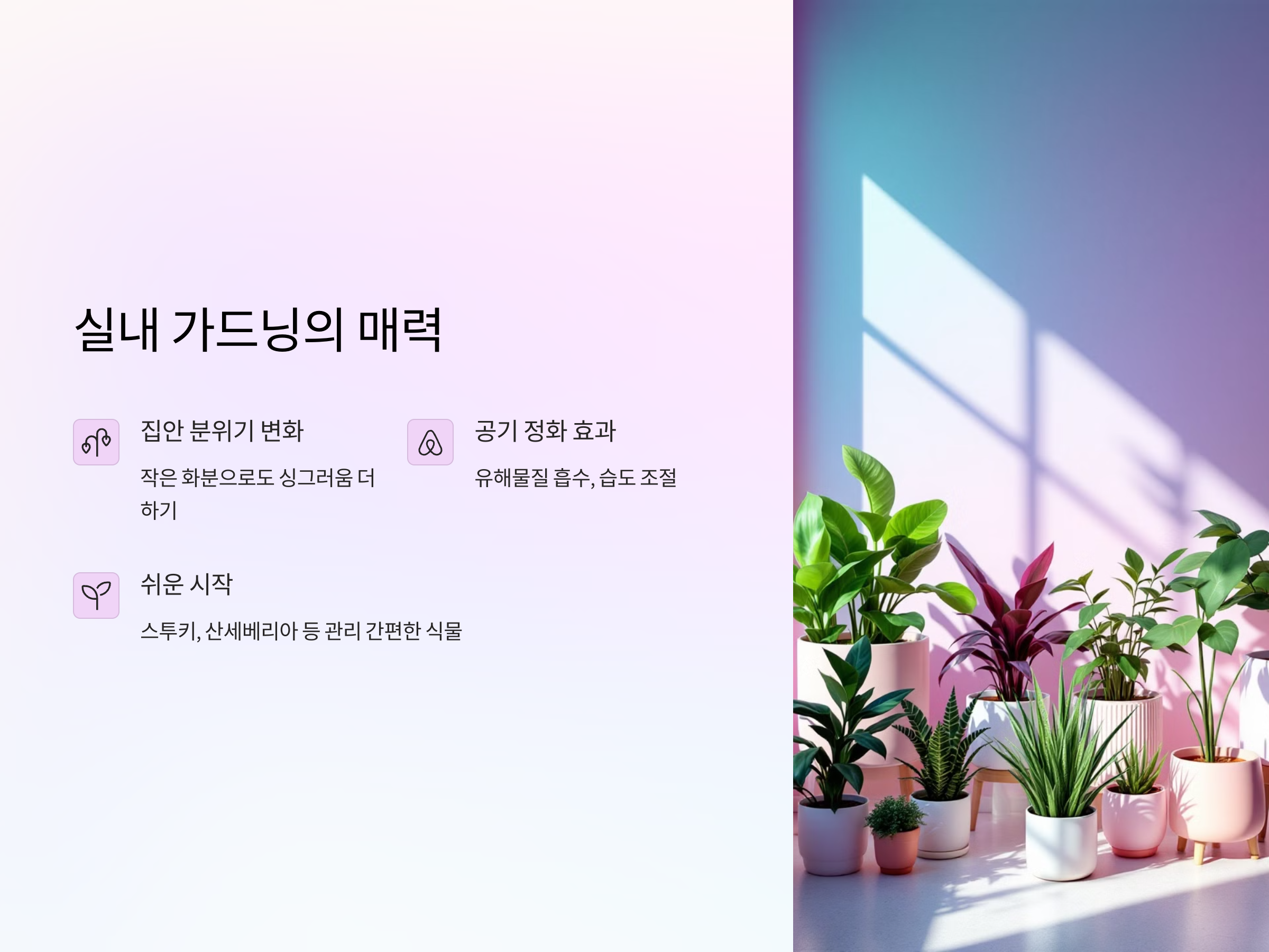 실내 가드닝은 집안의 분위기를 전혀 다른 느낌으로 변화시킬 수 있습니다. 작은 화분 하나로도 집안에 자연의 싱그러움을 더할 수 있으며, 여러 식물을 배치함으로써 더욱 풍성하고 다채로운 환경을 만들 수 있습니다. 실내 가드닝의 매력은 그저 보기 좋다는 것뿐만 아니라, 공기를 정화하고 스트레스를 감소시키는 데에도 효과적입니다. 특히 식물들은 집안의 습도를 조절하고, 일부 식물들은 유해 물질을 흡수하여 실내 공기를 정화하는 역할도 합니다.