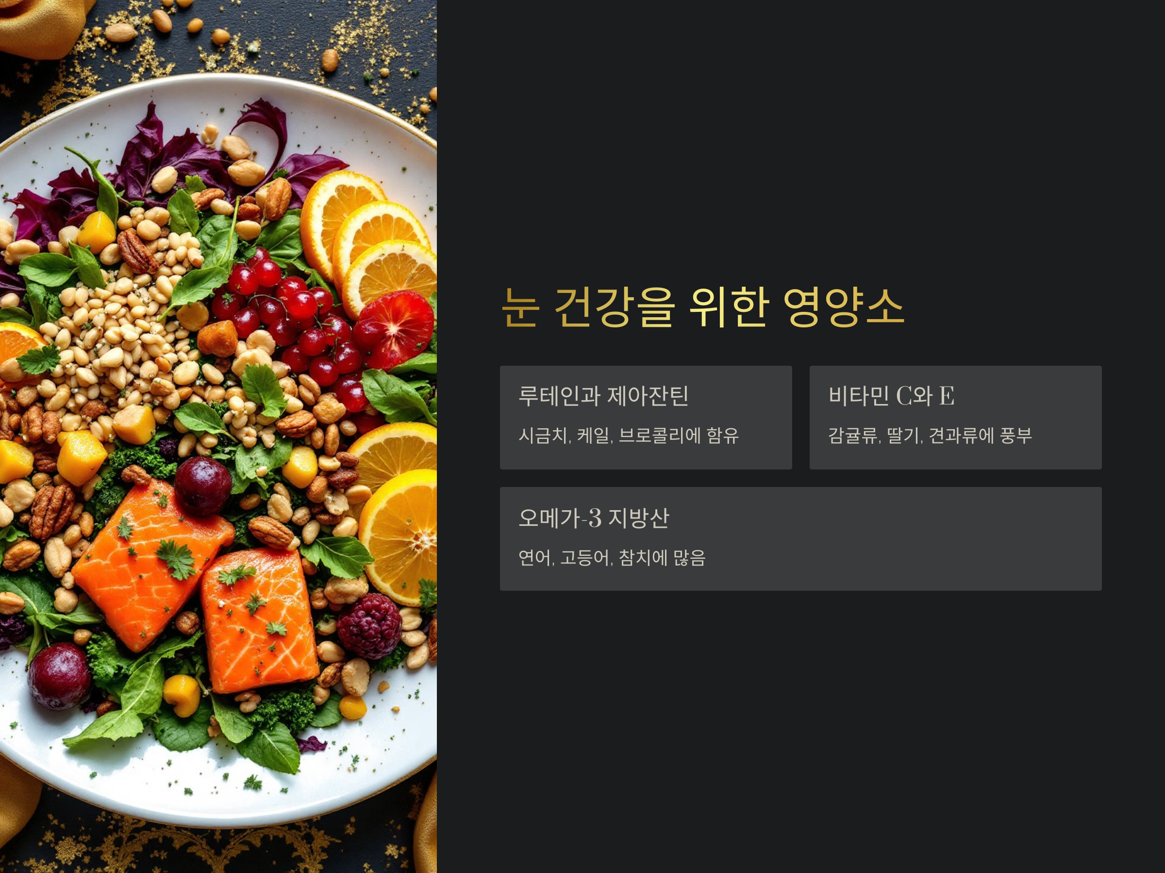 - 오메가-3 지방산: 연어, 고등어, 참치 등의 생선에 많으며, 눈물막을 안정적으로 유지해 눈의 건조를 막아줍니다.