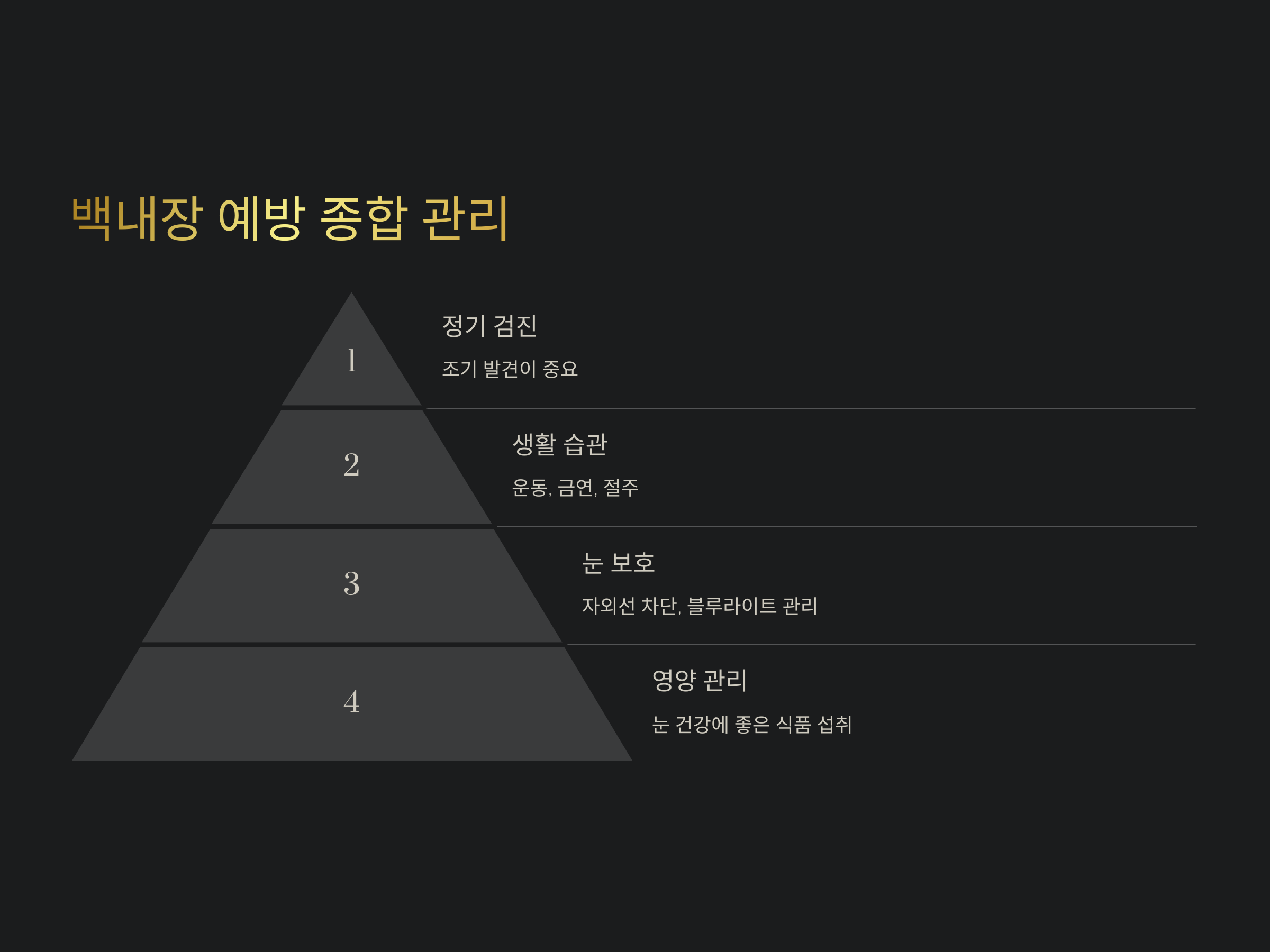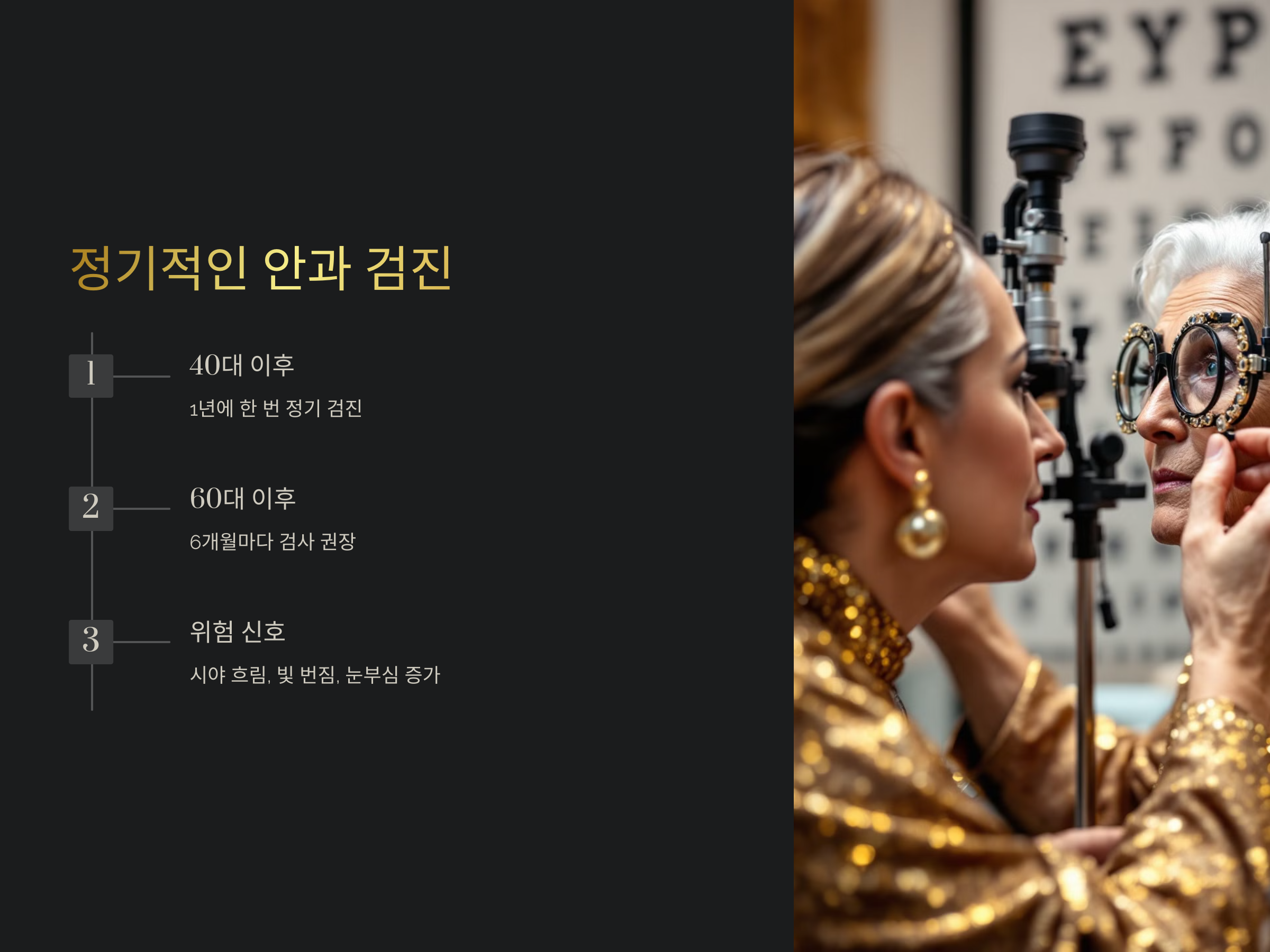 백내장은 초기 증상이 뚜렷하지 않아 자각하기 어려운 경우가 많습니다. 따라서 정기적인 안과 검진을 통해 조기에 발견하고 적절한 치료를 받는 것이 중요합니다. 보통 40대 이후부터는 1년에 한 번 정기 검진을 받는 것이 좋으며, 60대 이후에는 6개월마다 검사를 권장합니다.