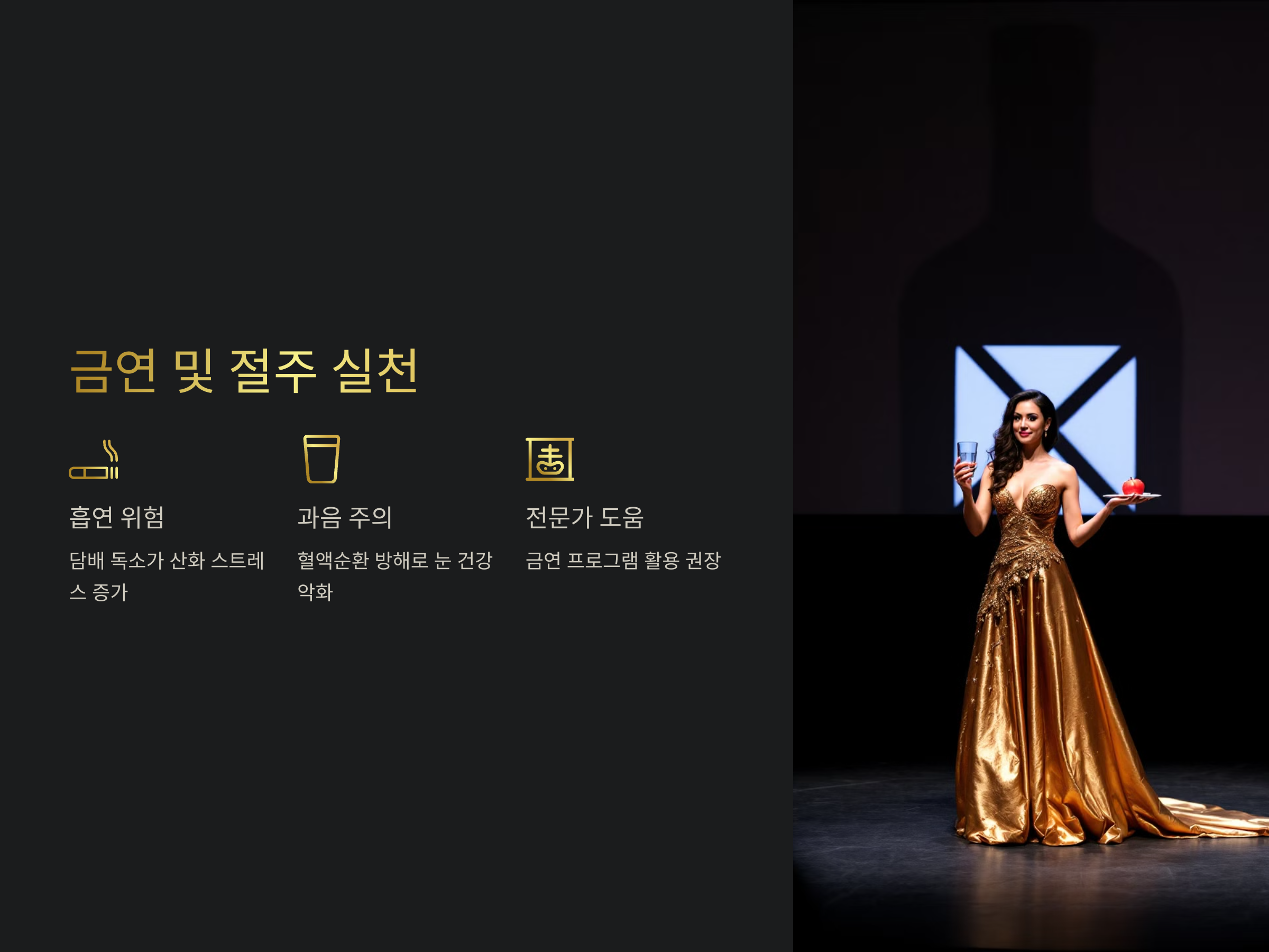 따라서 금연을 실천하고, 술은 적당량을 유지하는 것이 백내장 예방에 도움이 됩니다. 만약 금연이 어렵다면 전문가의 도움을 받아 금연 프로그램을 활용하는 것도 좋은 방법입니다.