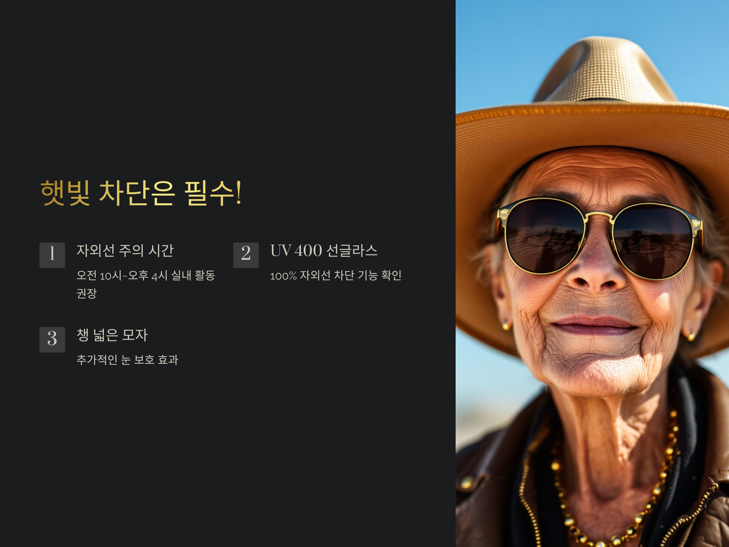 자외선은 백내장의 주요 원인 중 하나입니다. 특히 퇴직 후 야외활동을 즐기는 분들은 자외선 차단에 더욱 신경 써야 합니다. 자외선이 강한 오전 10시부터 오후 4시까지는 되도록 실내에서 활동하는 것이 좋으며, 외출 시에는 UV 차단 렌즈가 포함된 선글라스를 착용해야 합니다. 또한, 챙이 넓은 모자를 쓰는 것도 눈을 보호하는 좋은 방법입니다.