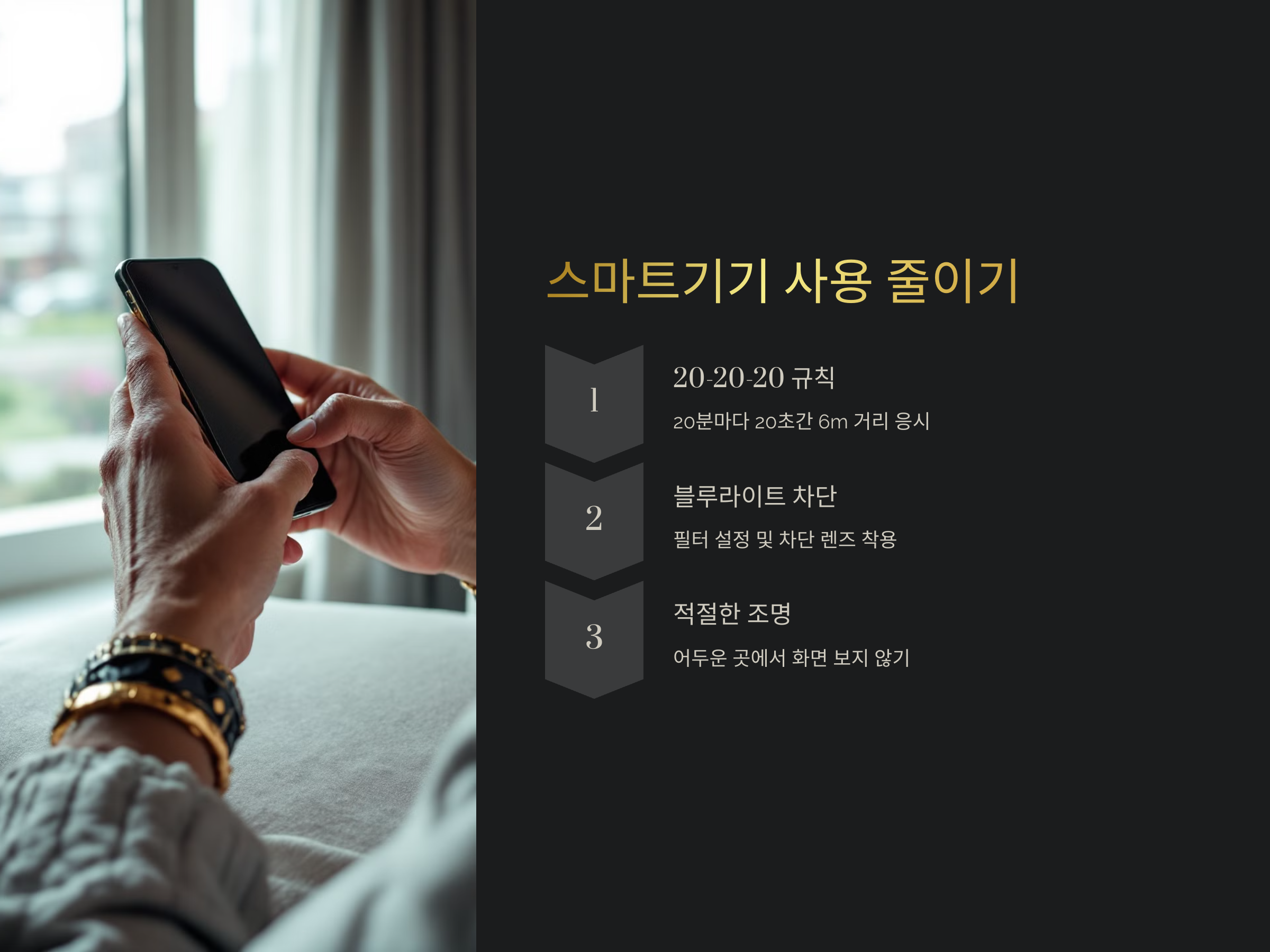 - 블루라이트 차단 필터 사용: 스마트폰이나 컴퓨터에 블루라이트 필터를 설정하고, 필요시 블루라이트 차단 렌즈를 착용합니다.