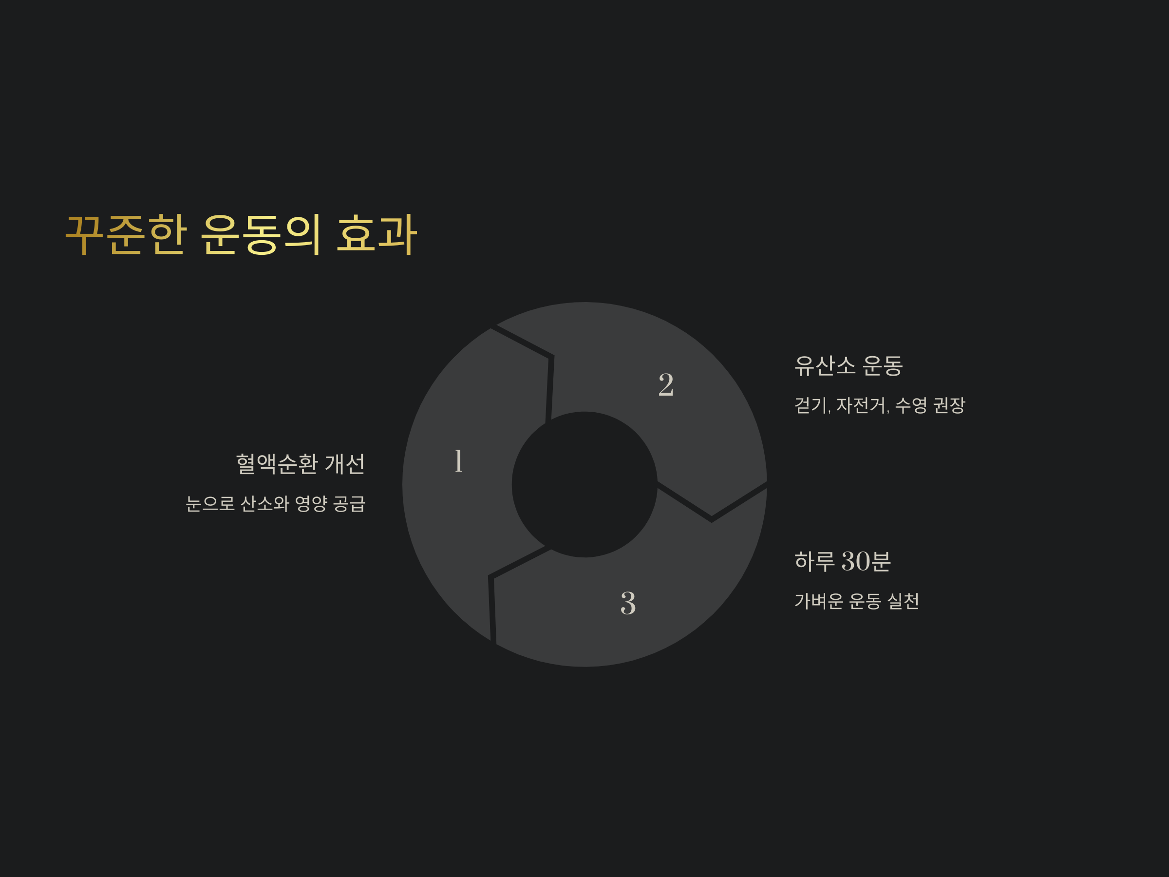 특히 유산소 운동(걷기, 자전거 타기, 수영 등)은 눈 건강에 긍정적인 영향을 미칩니다. 하루 최소 30분 정도의 가벼운 운동을 실천해 보세요.