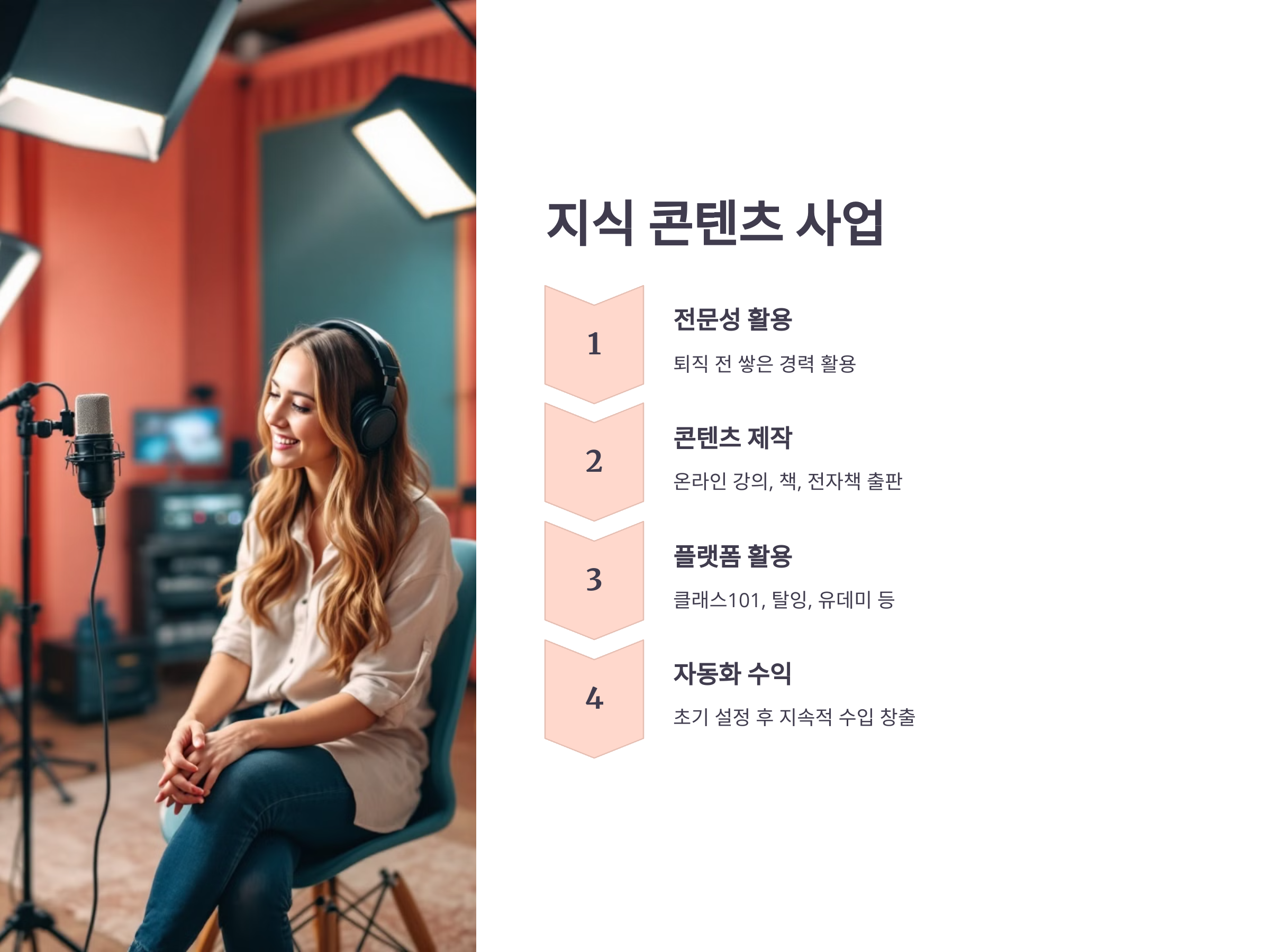 예를 들어, 30년간 인사팀에서 일한 사람이 '면접 노하우'를 주제로 온라인 강의를 열거나, 회계 전문가가 '초보자를 위한 세무 가이드북'을 출판하는 식입니다. 이렇게 자신의 경험을 바탕으로 콘텐츠를 제작하면 신뢰도와 전문성이 높아져 자연스럽게 수강생을 유치할 수 있습니다. 무엇보다 초기 설정만 잘 해놓으면 자동화된 수익 구조로 이어지는 장점이 있습니다.