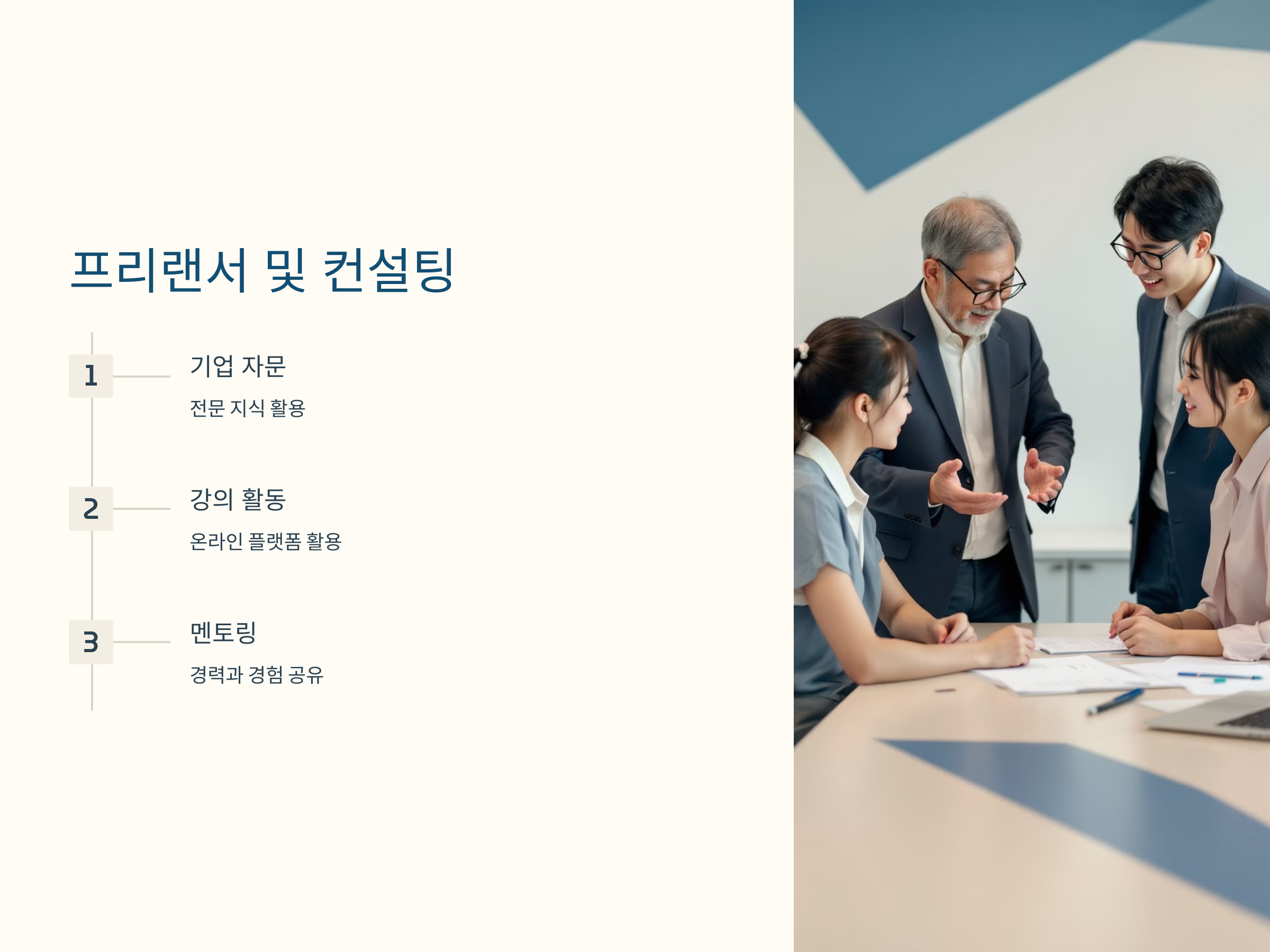 퇴직 후에는 그동안 쌓아온 경력을 활용해 프리랜서나 컨설턴트로 활동할 수도 있습니다. 기업 자문, 강의, 코칭, 멘토링 등의 방식으로 경제적 가치를 창출할 수 있습니다.
