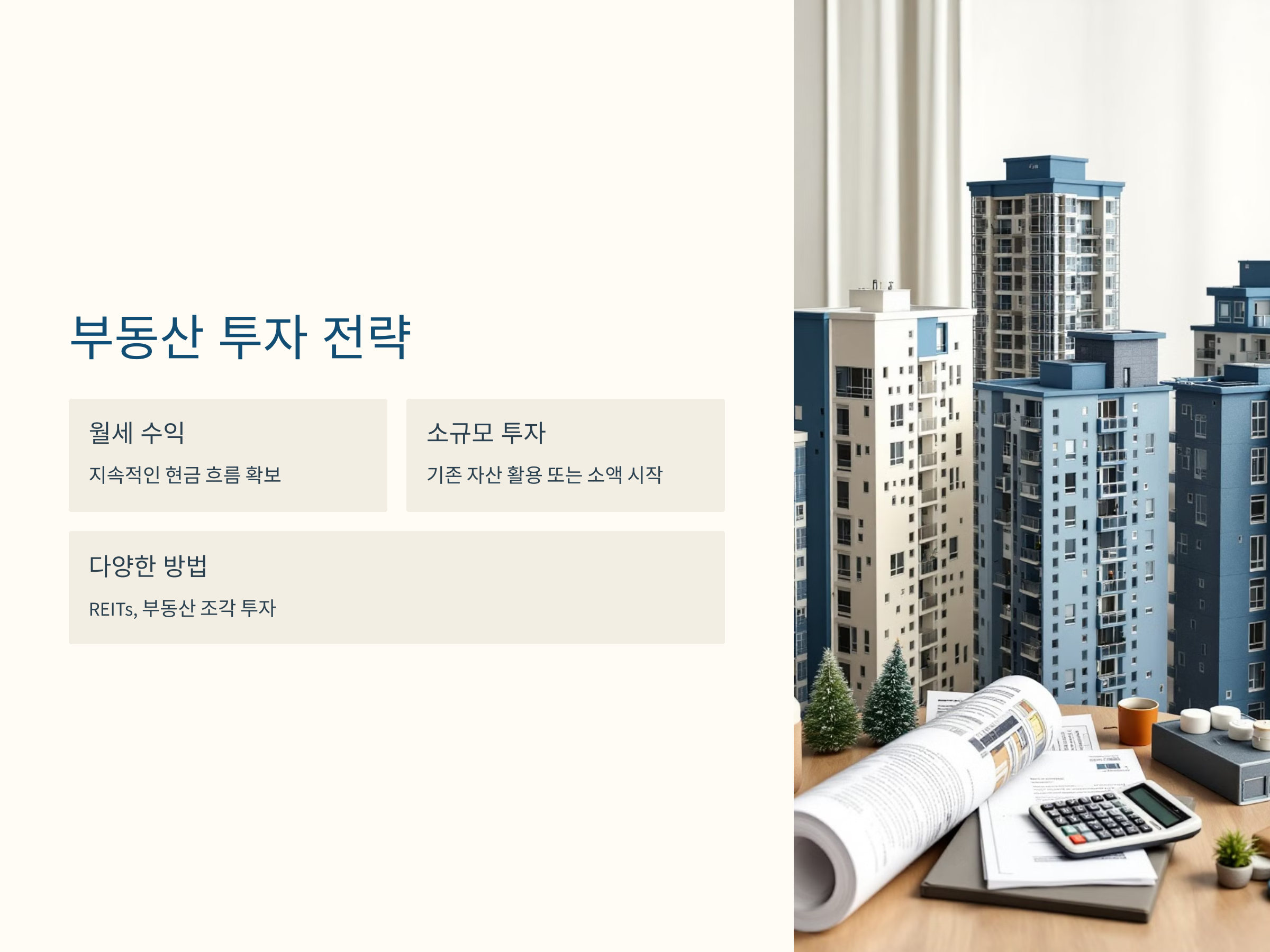 퇴직 후에는 큰돈을 들여 새로운 부동산을 매입하기보다는 기존 자산을 활용하거나 소규모 투자부터 시작하는 것이 현명합니다. 최근에는 부동산 펀드(REITs)나 조각 투자 등 소액으로도 참여할 수 있는 방법이 많아졌습니다.