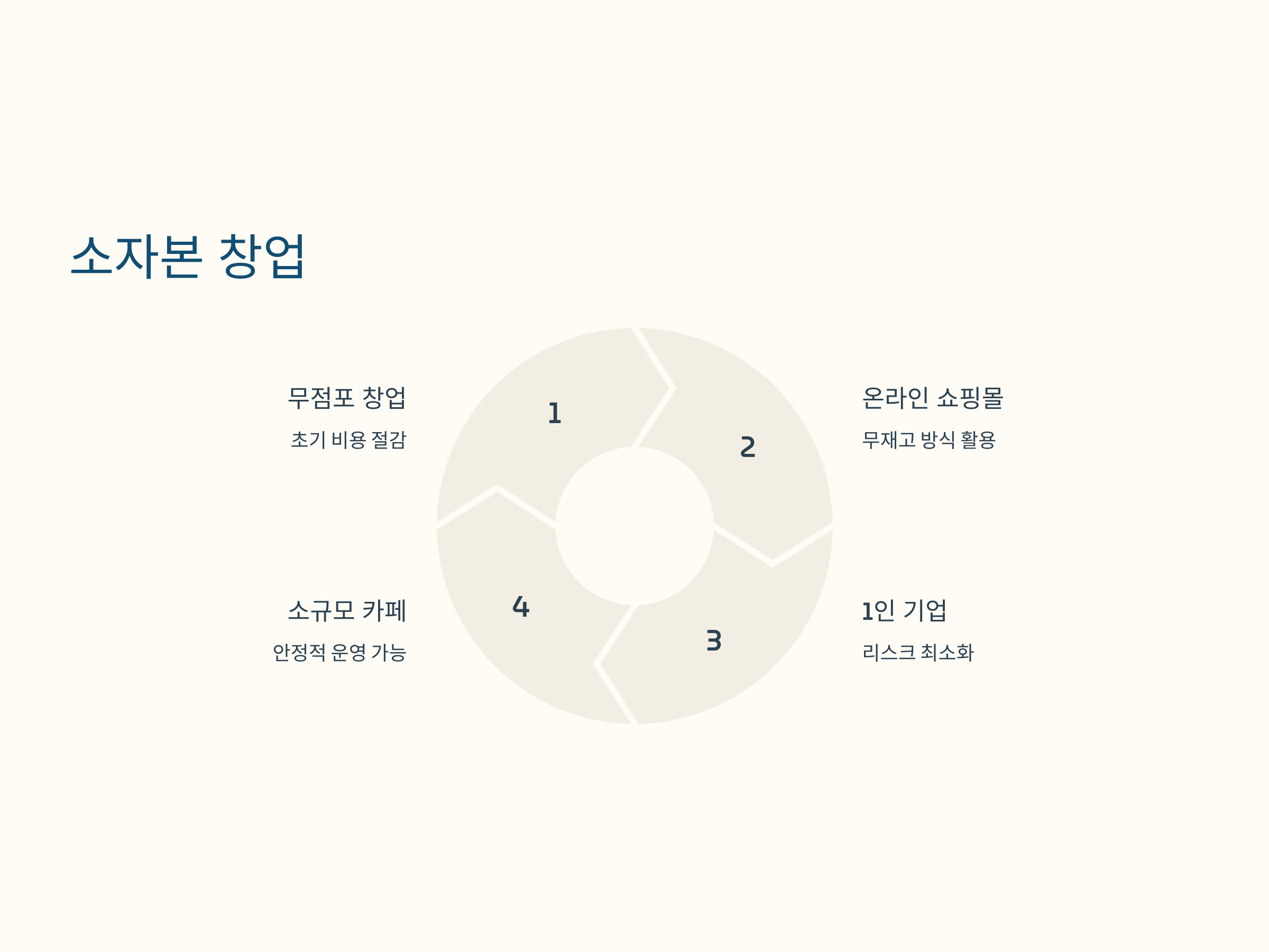 소자본 창업을 고려할 때는 무점포 창업, 무재고 쇼핑몰, 소규모 카페 운영, 1인 기업 등의 방식이 인기입니다. 특히 온라인 창업은 상대적으로 적은 비용으로 시작할 수 있어 퇴직자들에게 좋은 기회가 될 수 있습니다.