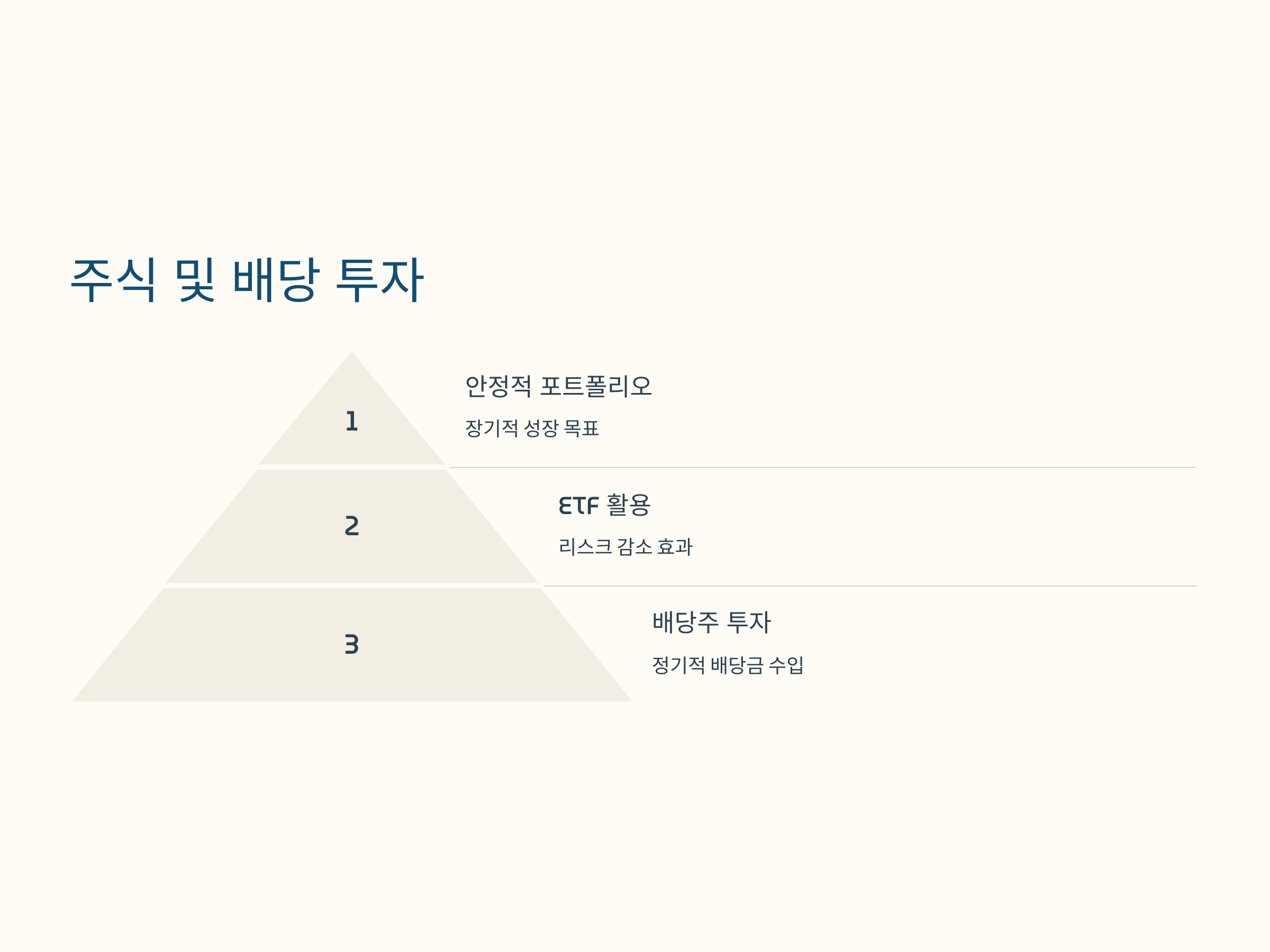 배당주 외에도 ETF(상장지수펀드)와 같은 상품을 활용하면 리스크를 줄이면서도 장기적인 성장을 기대할 수 있습니다. 중요한 것은 단기적인 수익보다 안정적인 포트폴리오를 구축하는 것입니다.
