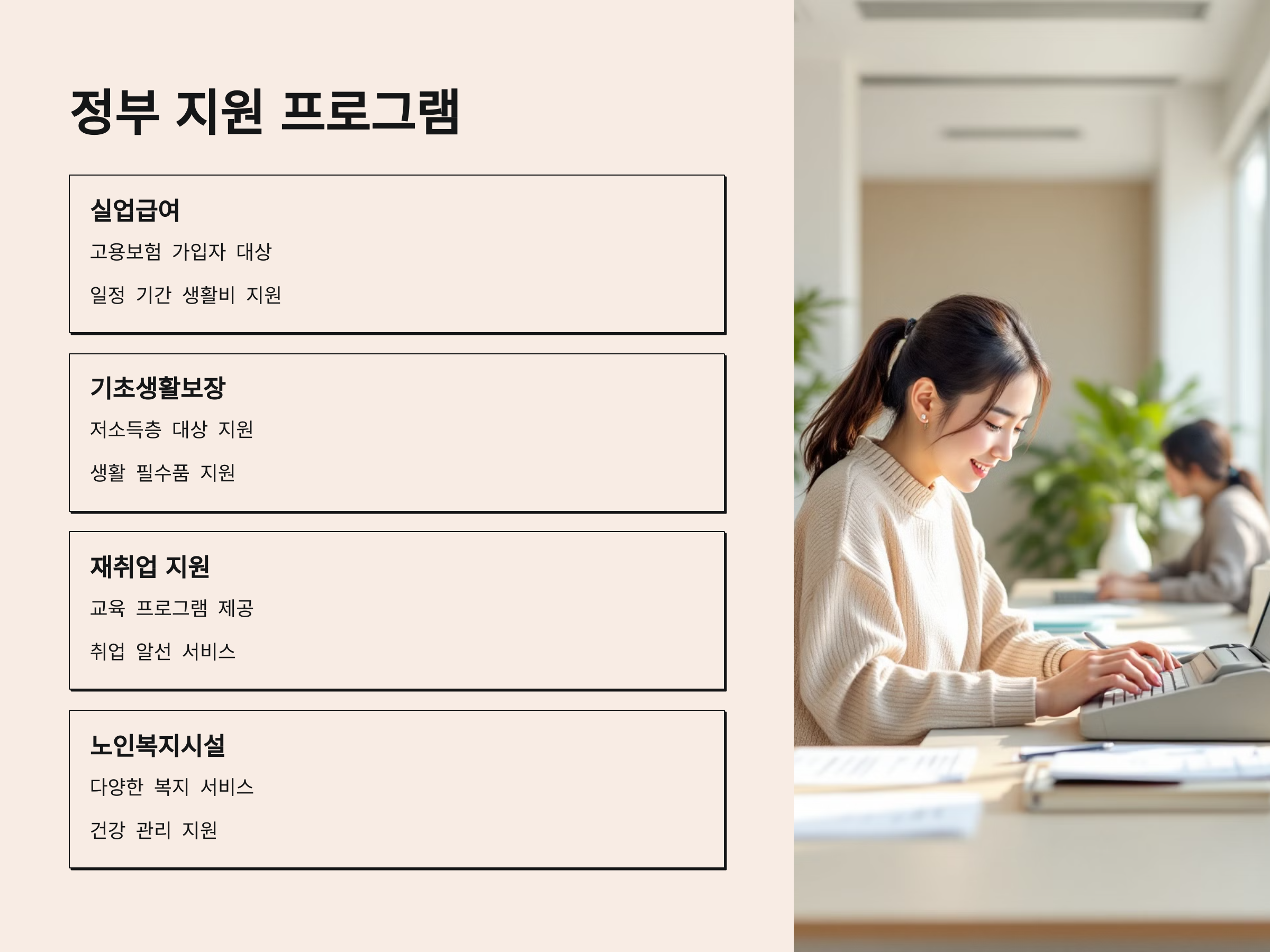 퇴직 후 소득을 유지하기 위해서는 정부에서 제공하는 다양한 지원 프로그램을 잘 활용하는 것이 중요합니다. 예를 들어, 고용보험에 가입되어 있다면 실업급여를 받을 수 있으며, 이는 퇴직 후 일정 기간 동안 생활비를 지원해 줍니다. 또한 저소득층을 위한 다양한 정부 지원이 존재하는데, 기초생활보장, 노인복지시설 지원, 장기요양보험 등 다양한 프로그램이 있습니다.