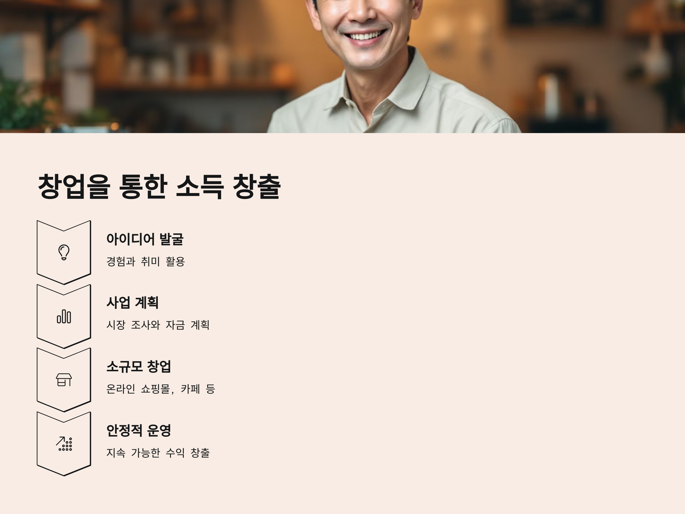 창업을 하면서 퇴직 후에도 안정적인 수입을 유지할 수 있습니다. 다만, 창업은 초기 투자와 일정 리스크가 따르므로 신중하게 계획을 세운 후 진행하는 것이 좋습니다. 창업에 대한 교육이나 전문가의 상담을 받는 것도 좋은 방법입니다.