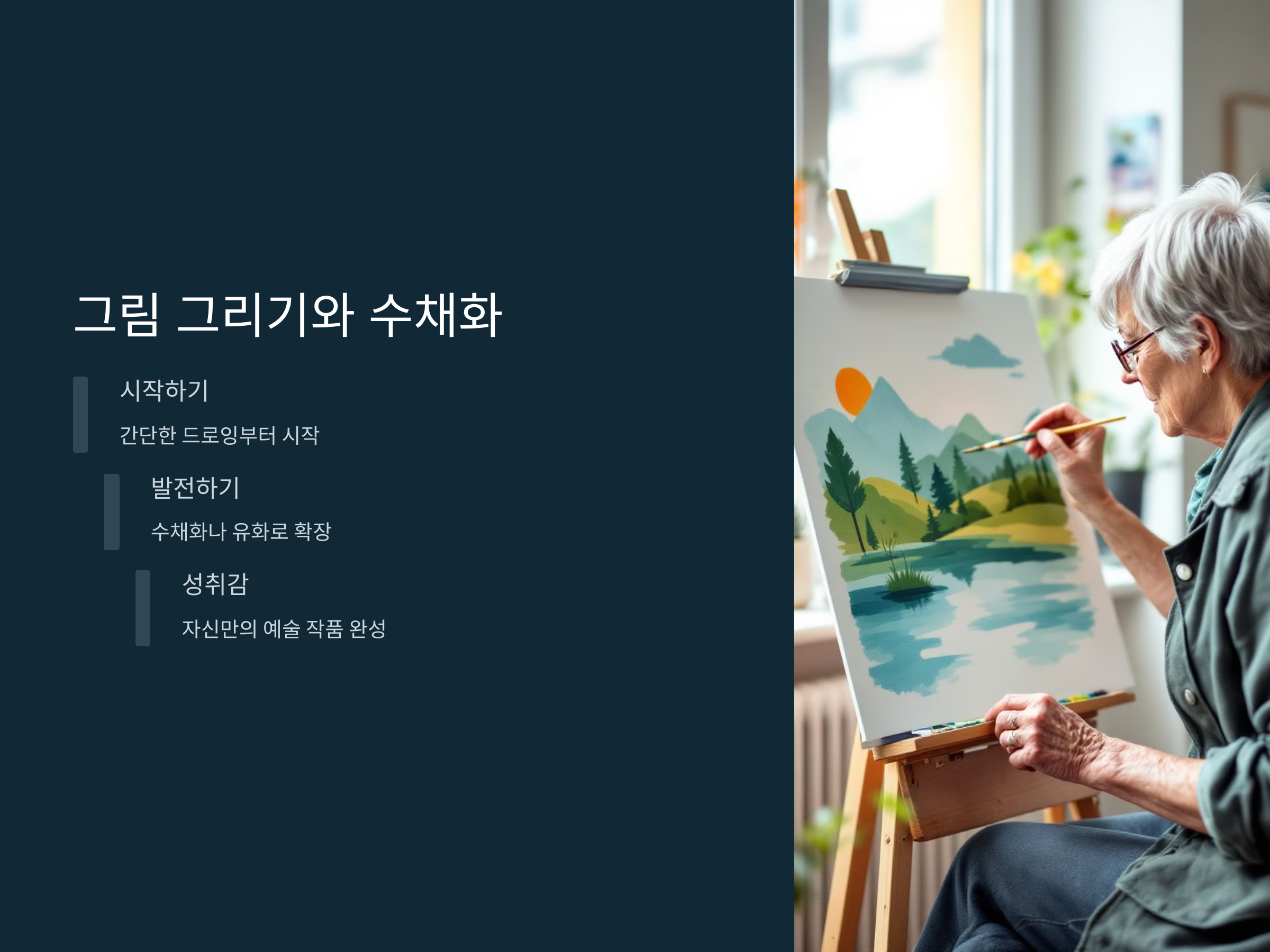 그림 그리기나 수채화는 창의력을 발휘할 수 있는 훌륭한 취미입니다. 퇴직 후 마음을 차분하게 가라앉히고, 색깔을 조합하며 자연의 아름다움을 담아낼 수 있습니다. 처음에는 간단한 드로잉에서 시작할 수 있으며, 수채화나 유화를 통해 점차 더 복잡한 작품으로 발전할 수 있습니다. 그림은 마음을 편안하게 해주는 동시에, 예술적 성취감을 느낄 수 있는 방법입니다. 퇴직 후 자신만의 예술 작품을 만드는 즐거움은 무엇과도 비교할 수 없는 만족감을 줍니다.