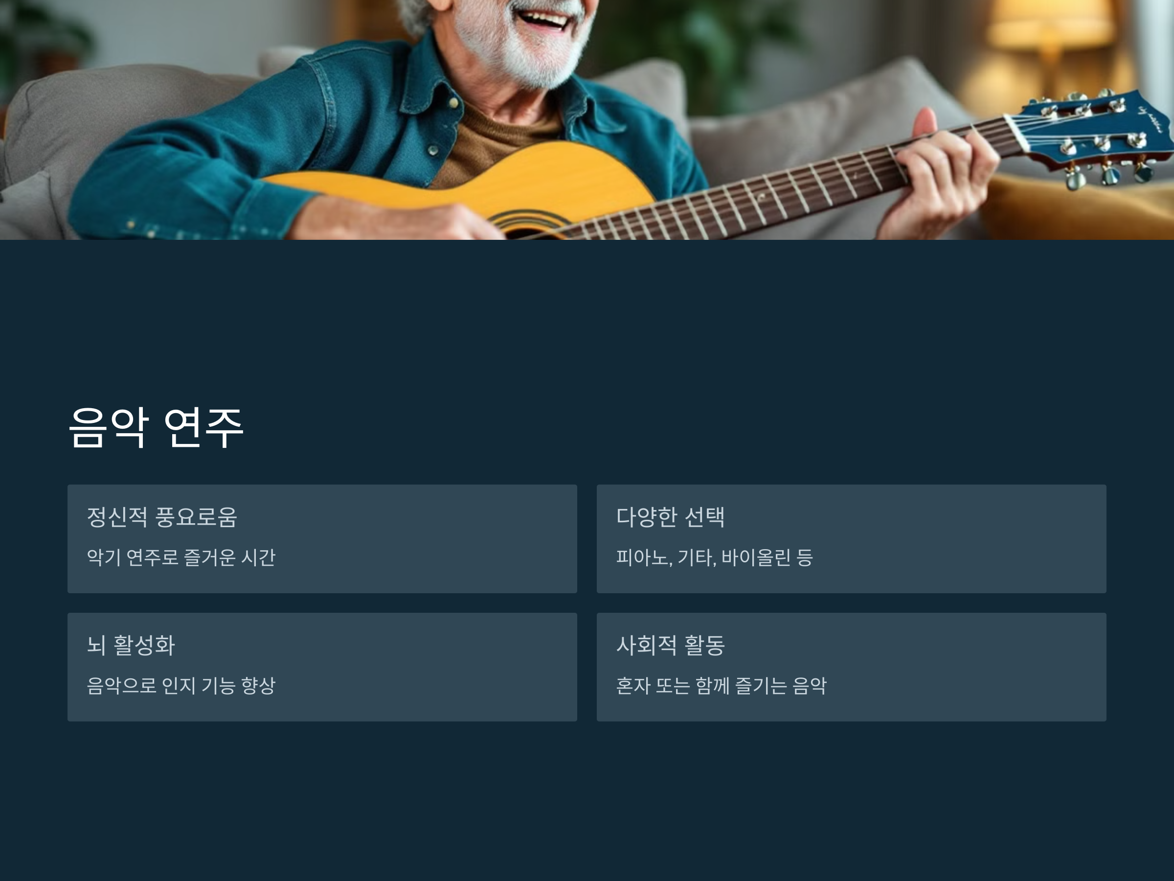 음악을 배우는 것은 정신적 풍요로움을 가져다주는 활동입니다. 악기를 다룰 수 있다면, 퇴직 후 시간을 더욱 즐겁게 보낼 수 있습니다. 피아노, 기타, 바이올린 등 다양한 악기를 배우기 시작하면 처음에는 어렵겠지만 점차 능숙해지는 기쁨을 느낄 수 있습니다. 음악은 또한 뇌를 활성화시키는 데 도움을 주며, 예술적인 감각을 키울 수 있는 훌륭한 취미입니다. 음악은 혼자서도 즐길 수 있으며, 다른 사람들과 함께 음악을 나누는 것도 큰 즐거움이 될 수 있습니다.