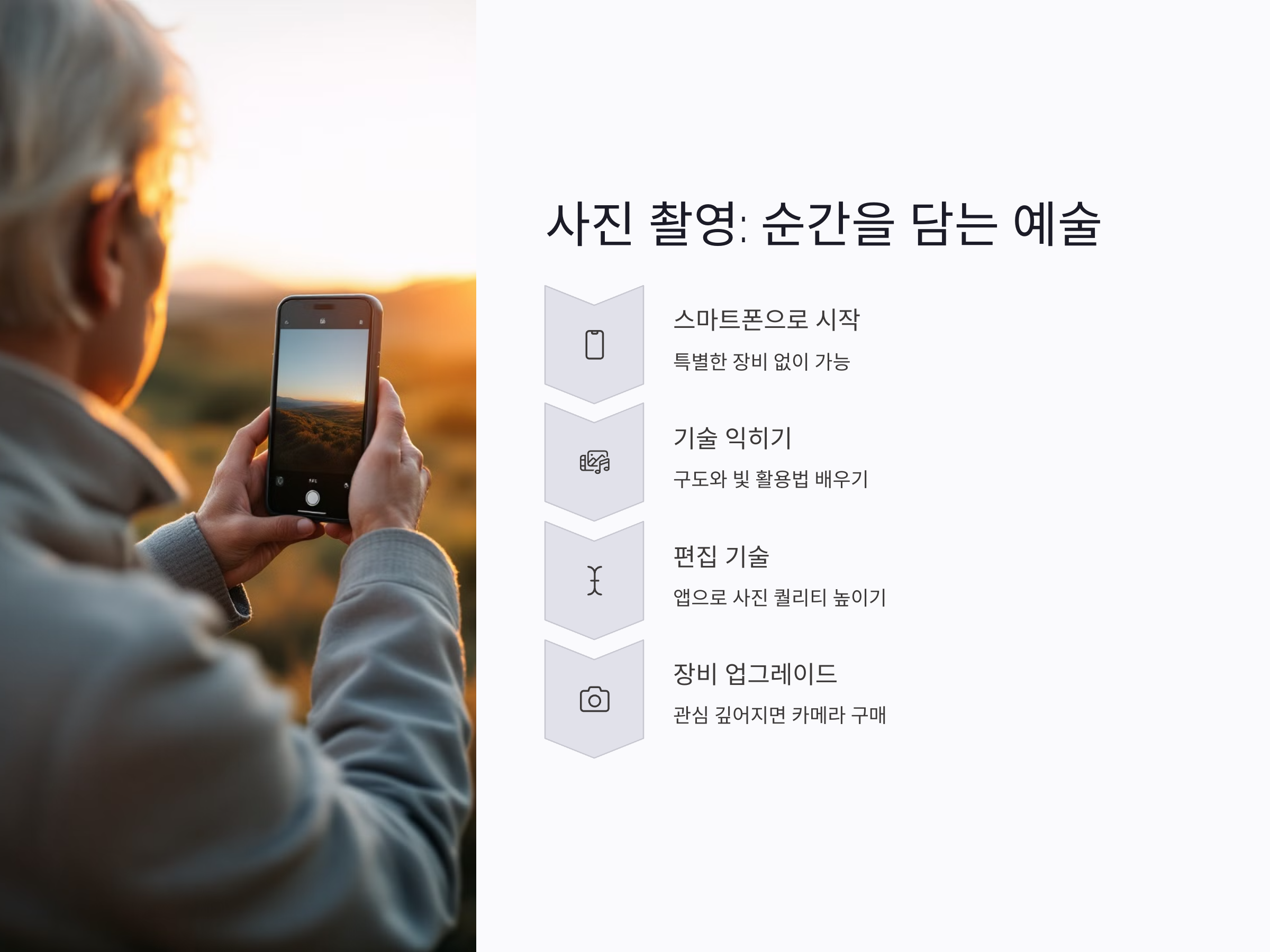 스마트폰을 사용해 처음에는 간단한 풍경이나 인물 사진을 찍어보세요. 촬영 기술을 조금씩 익히고, 편집 프로그램을 사용하여 사진의 퀄리티를 높일 수 있습니다. 점차 DSLR 카메라나 미러리스 카메라로 넘어가면 더욱 다양한 촬영 기법을 배우고, 취미로서 더 즐겁게 발전시킬 수 있습니다.