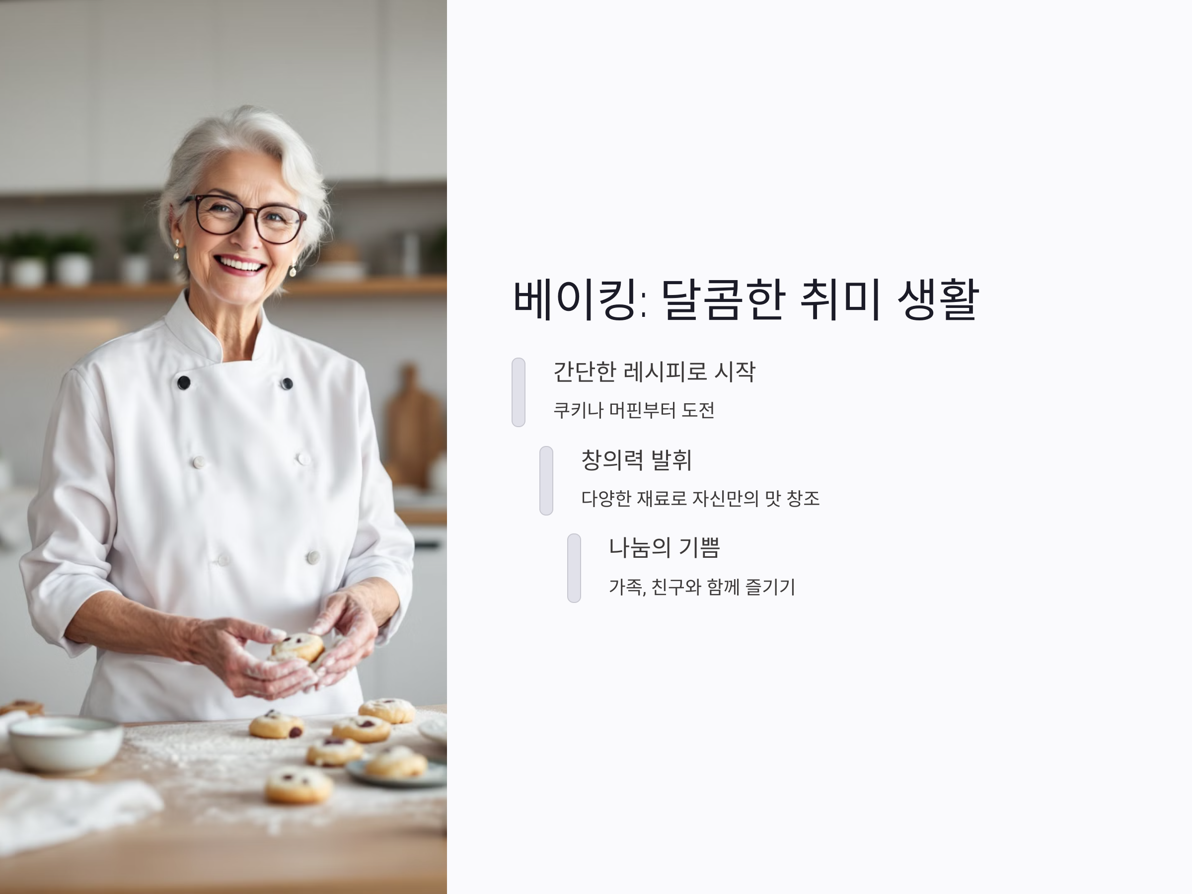 베이킹은 퇴직 후 시간적 여유가 생긴 후 도전하기 좋은 취미입니다. 케이크나 쿠키를 구우면서 창의력도 발휘하고, 직접 만든 음식을 가족과 함께 나누는 기쁨을 느낄 수 있습니다. 또한 베이킹은 생각보다 간단하게 배울 수 있으며, 집에서 혼자 하거나 친구들과 함께 즐길 수 있는 좋은 활동입니다.